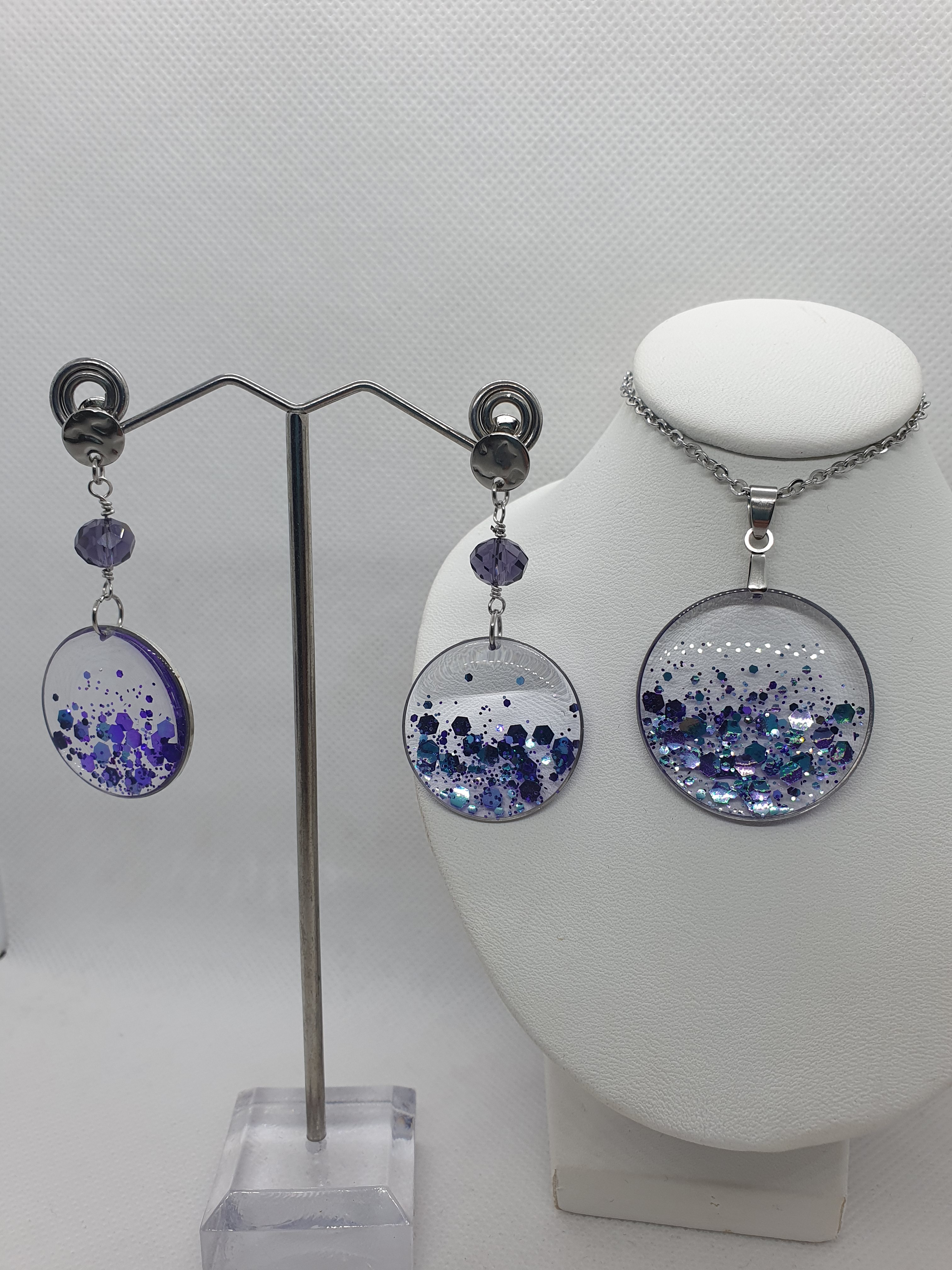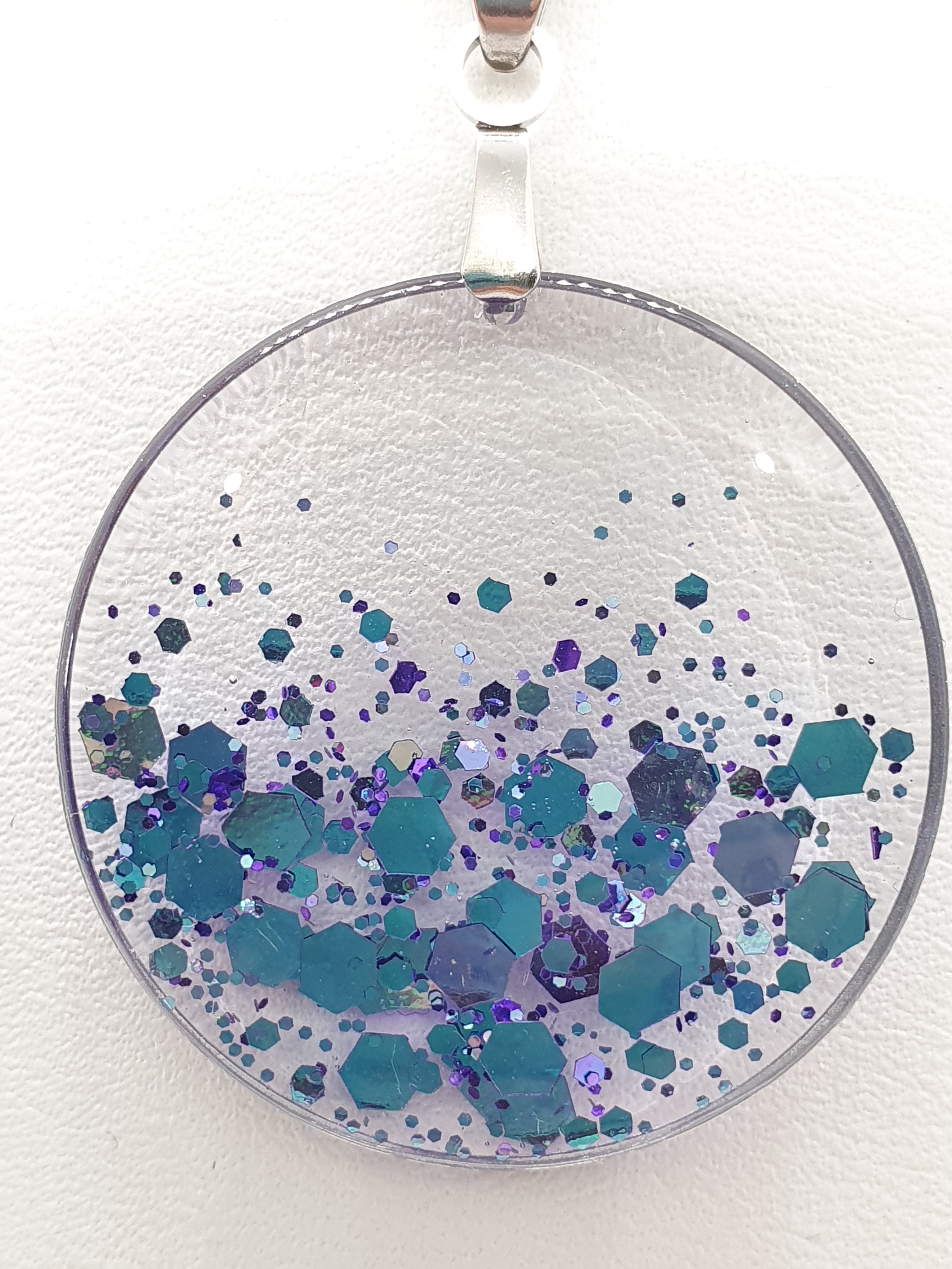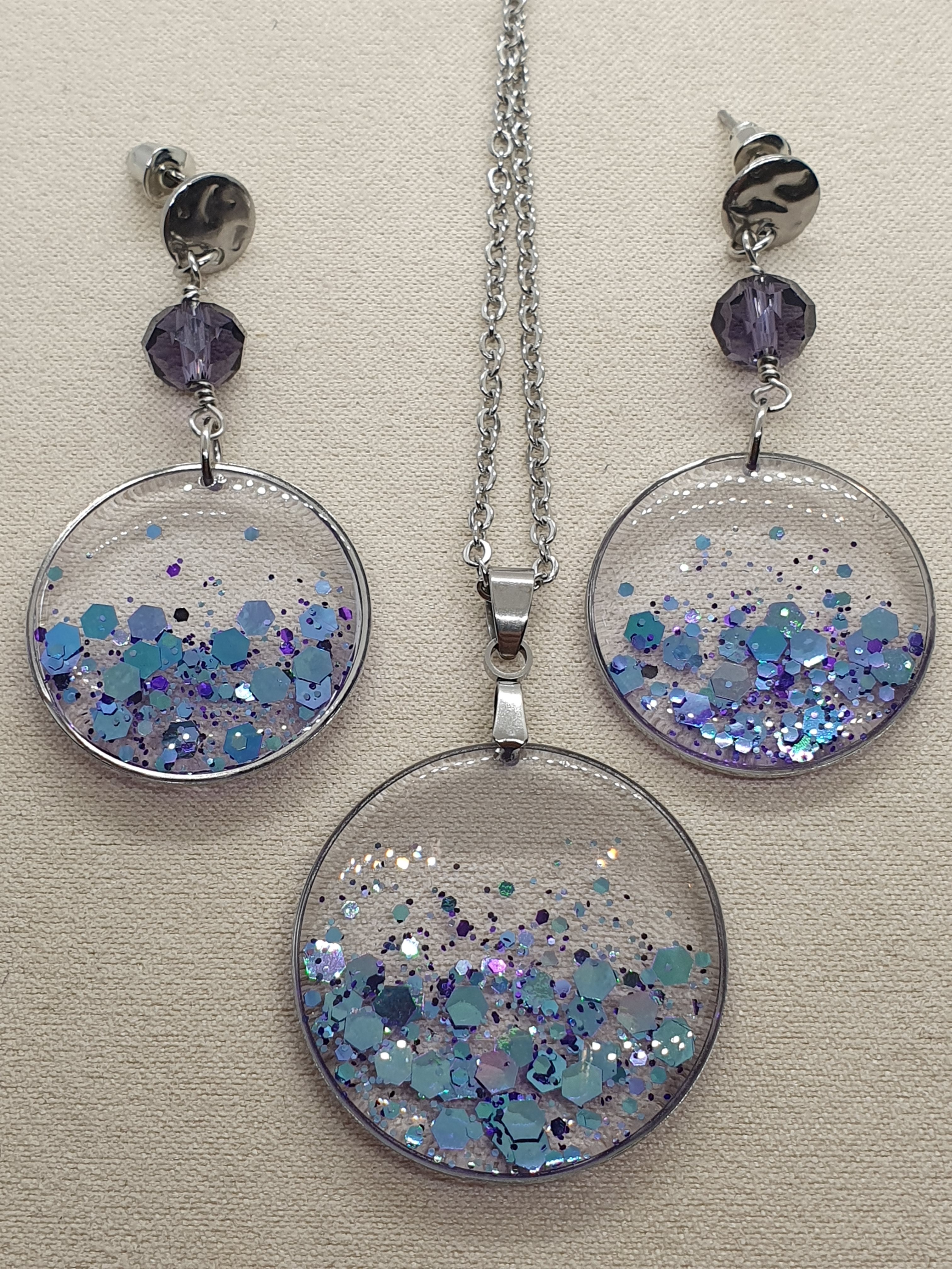 La résine translucide et parsemée de paillettes couleur parme, offre des reflets multicolores à couper le souffle.