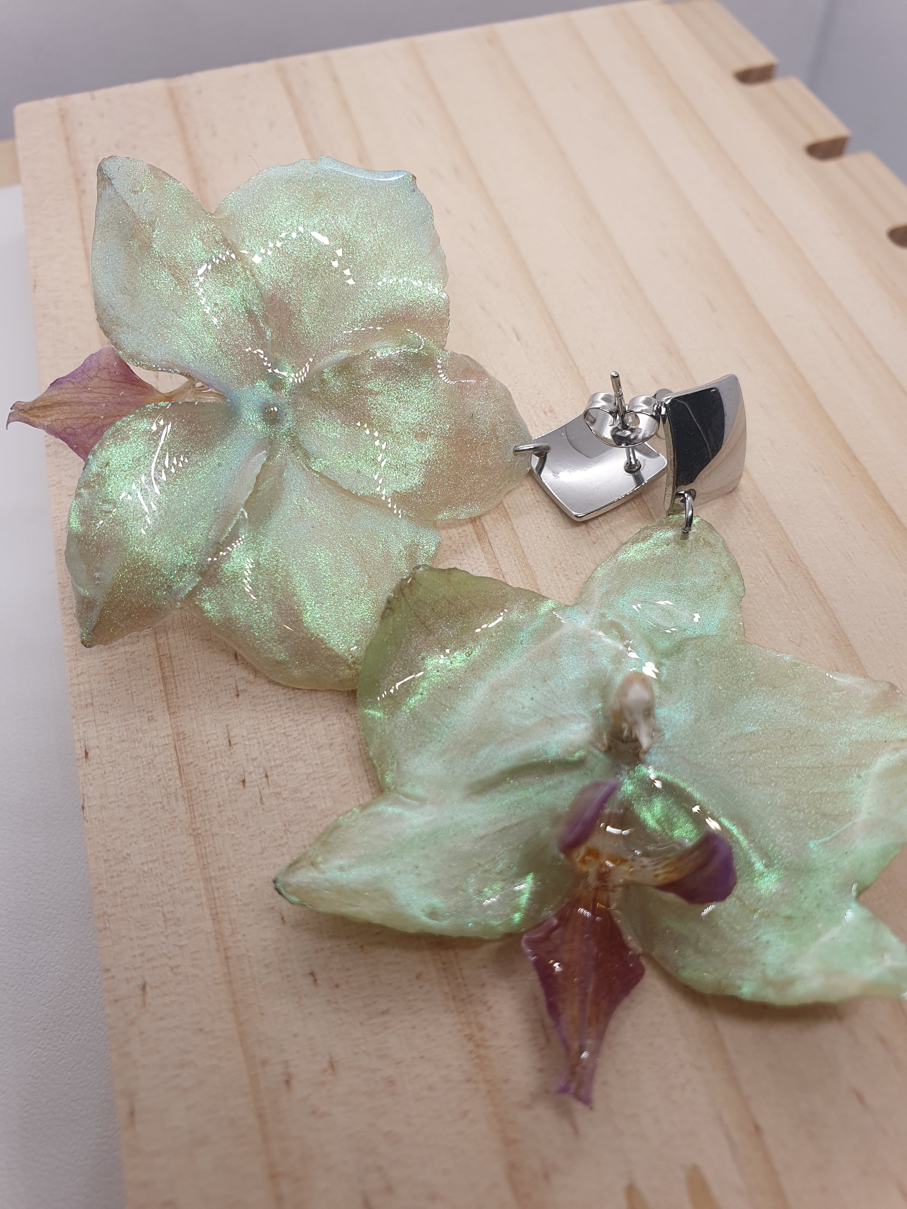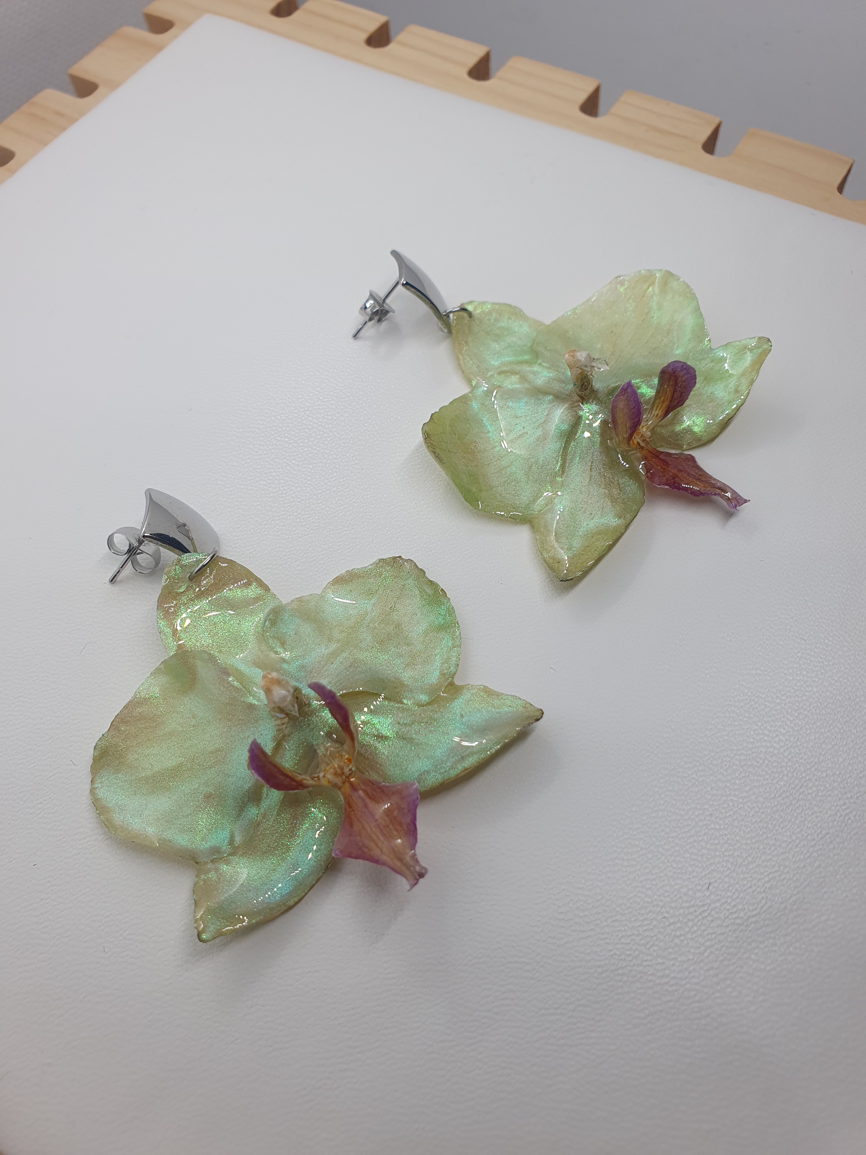 Les orchidées, symboles de beauté et de féminité, ont été délicatement peintes à la main avec une résine nacrée aux reflets verts, créant un bijou rafiné.