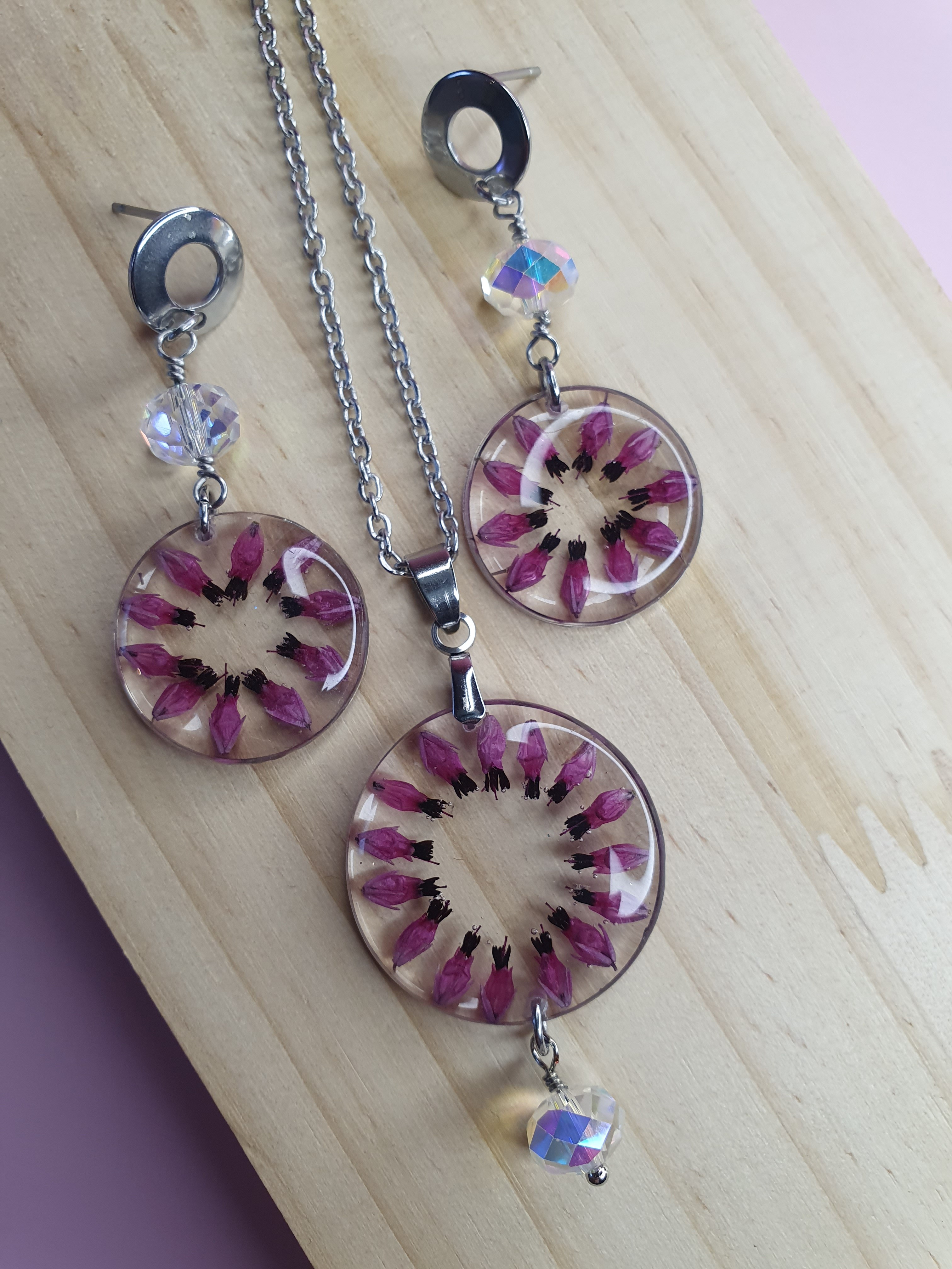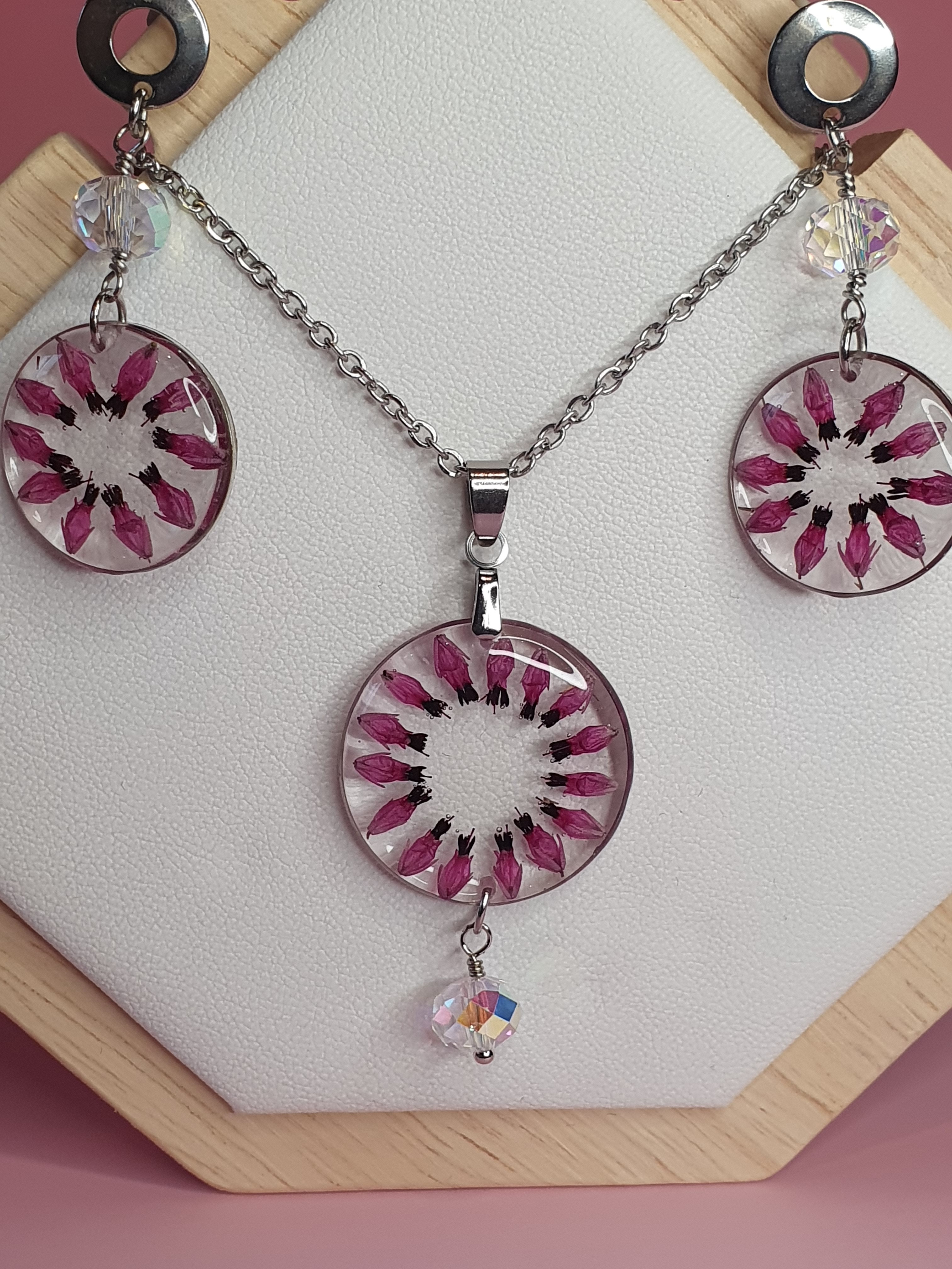 La toute nouvelle parure, mettant en avant de véritables fleurs de bruyère séchées, délicatement encapsulées dans de la résine. Chaque pièce est soigneusement conçue pour offrir un rendu chic et original, parfait pour sublimer toutes vos tenues.
