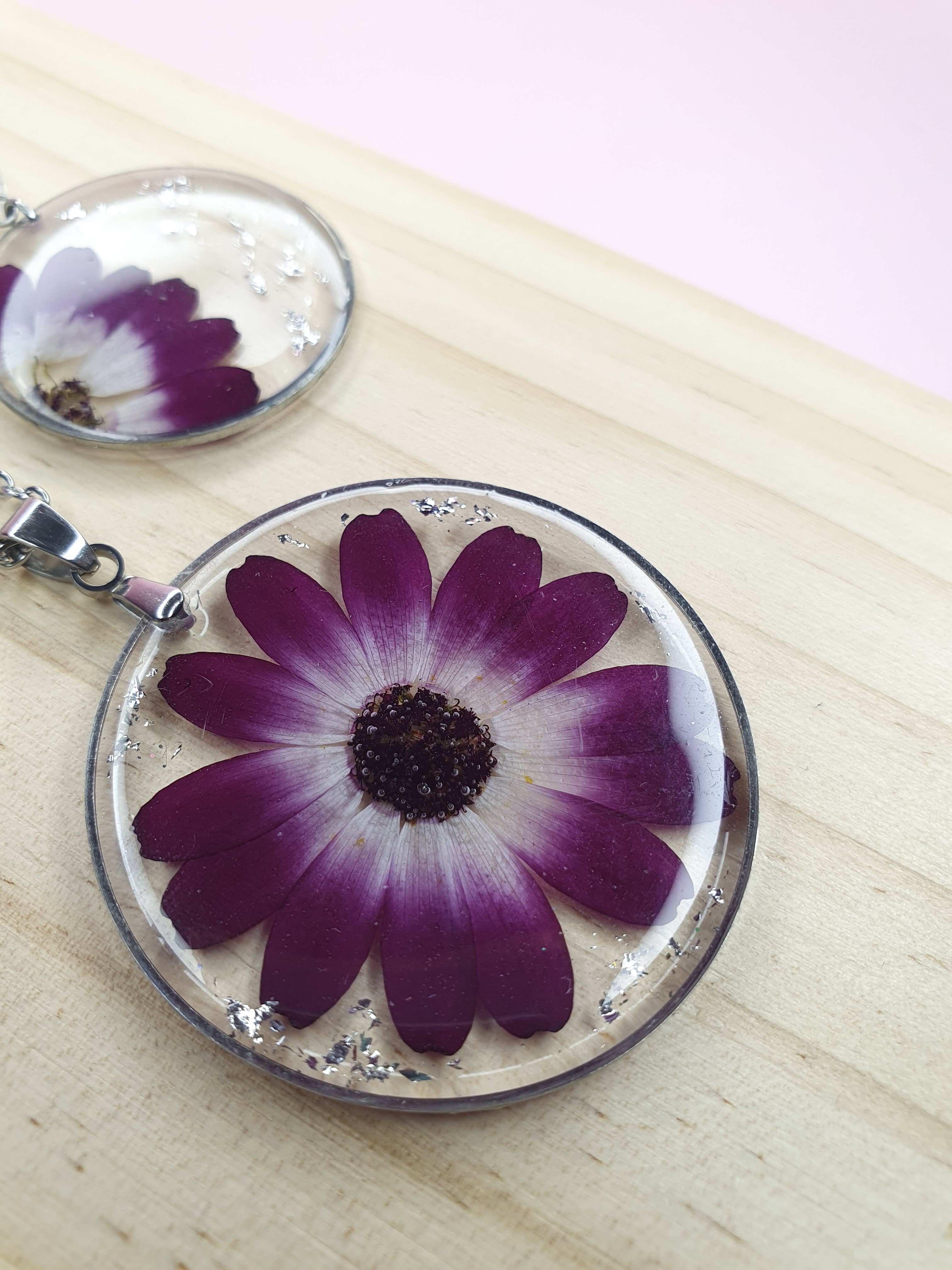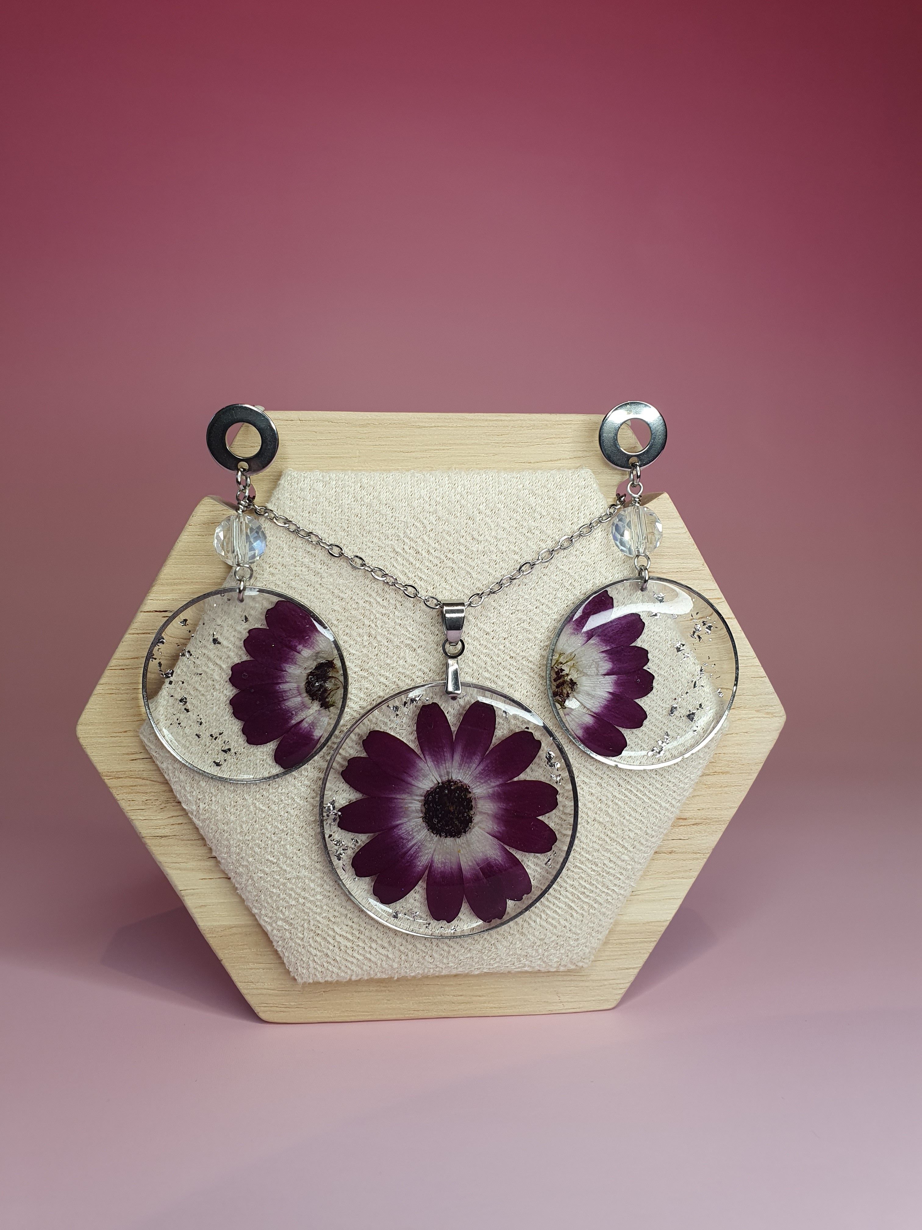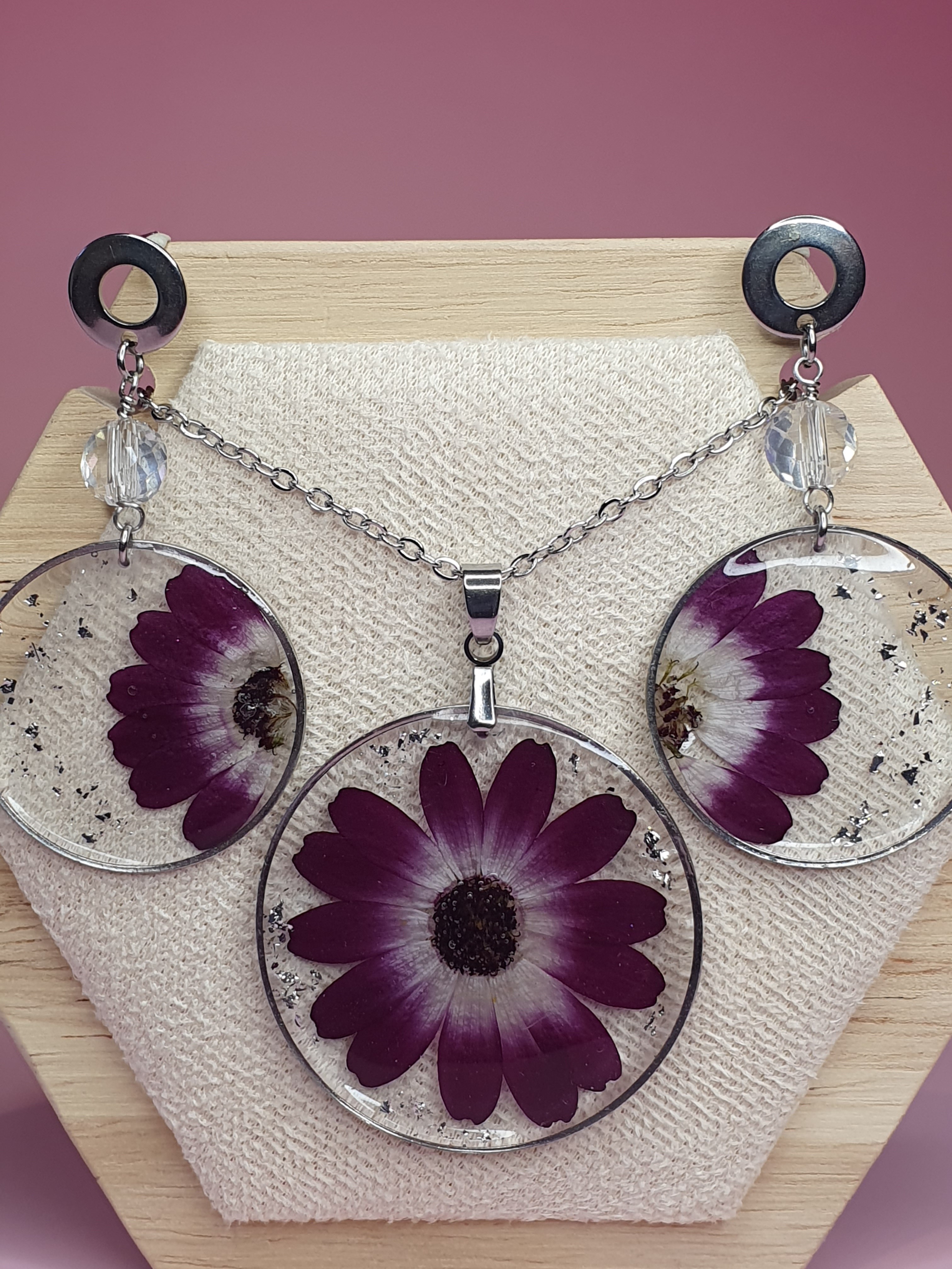 ✨ Réalisée avec de véritables fleurs de cinéraire rose foncé, elle est sublimée par des feuilles argentées qui captent la lumière à chaque mouvement.