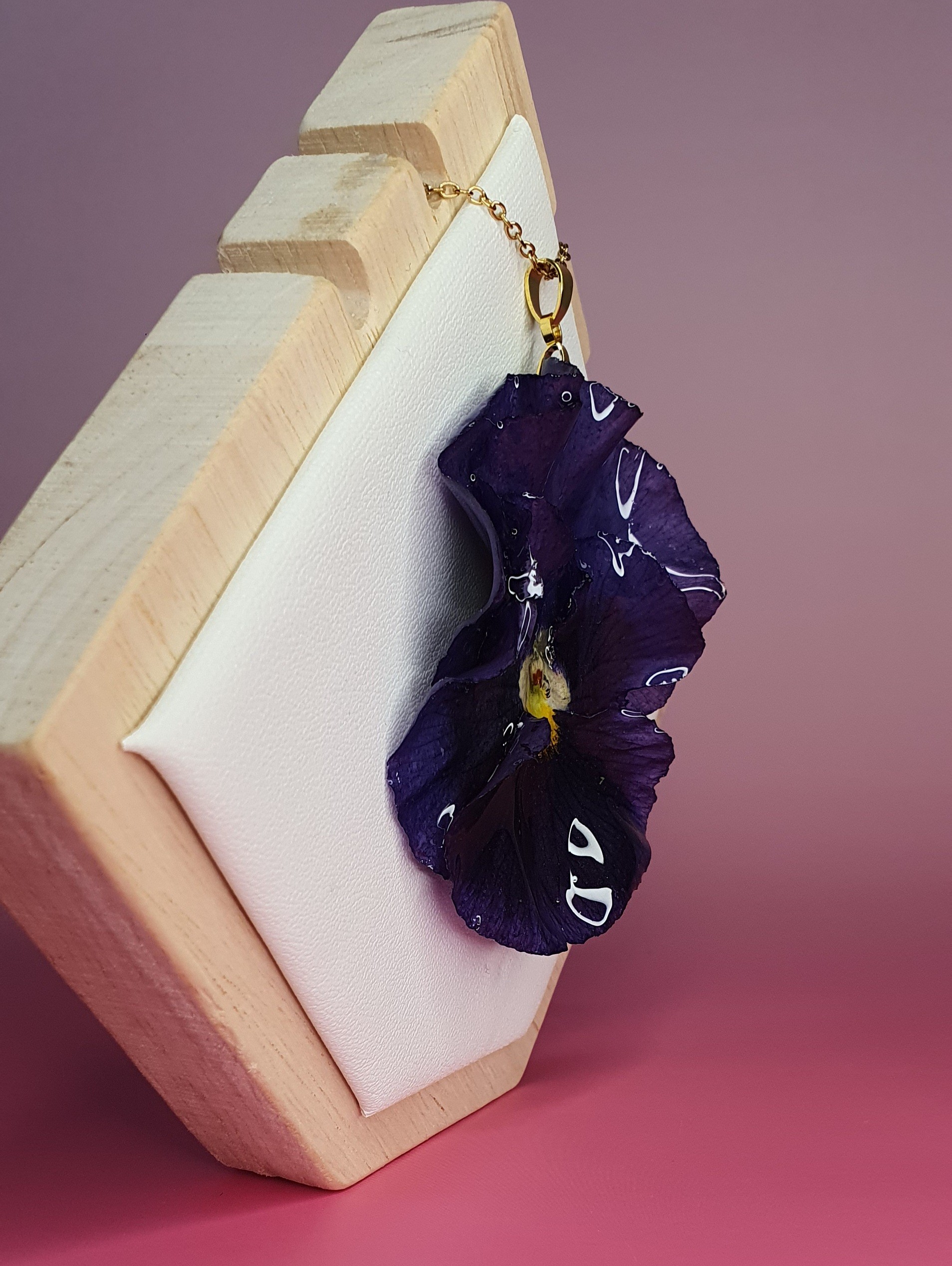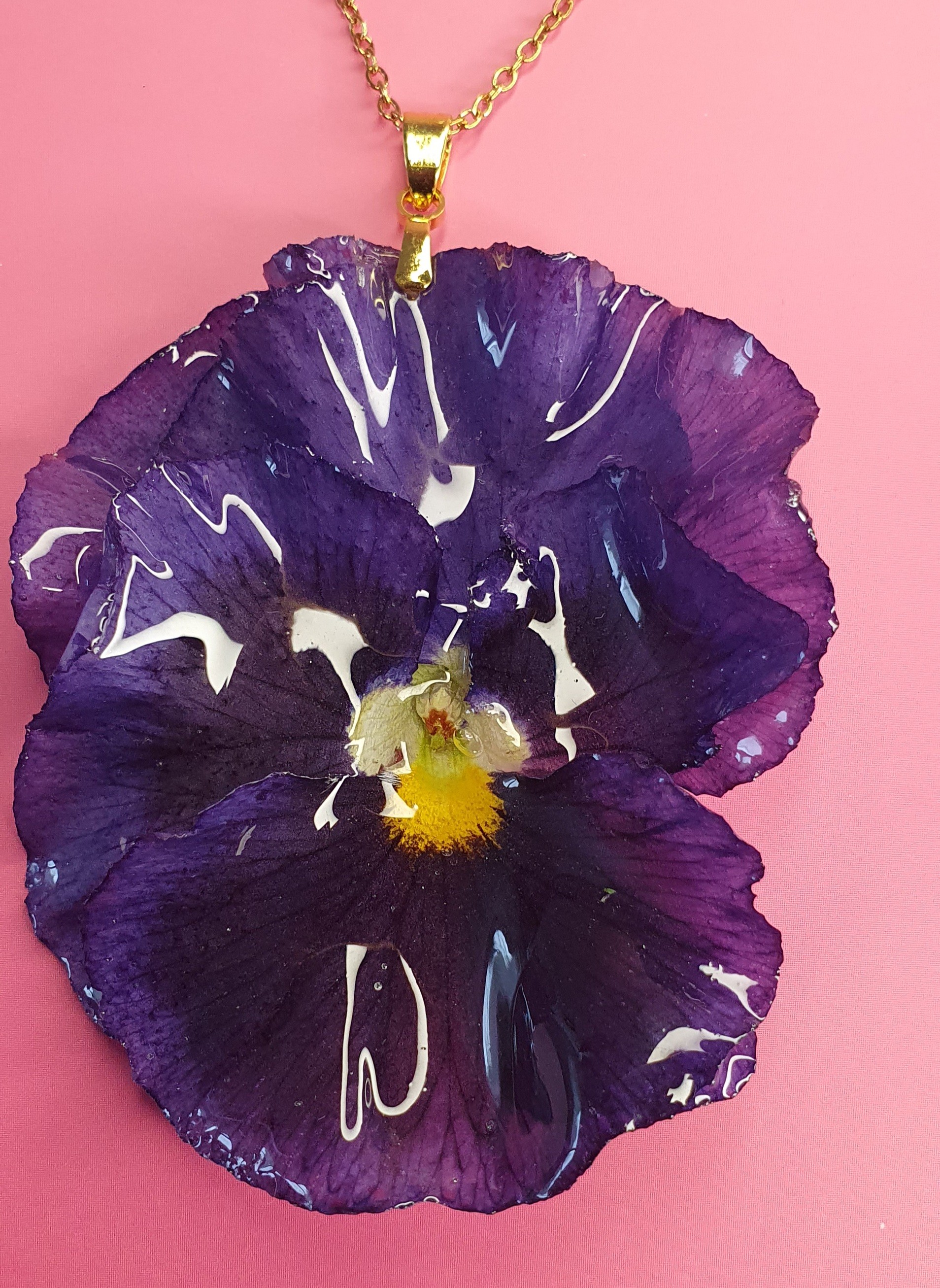 Laissez-vous séduire par la beauté brute et délicate de ce pendentif contenant une véritable fleur de Pensée violette, récoltée avec soin, puis séchée et figée dans une résine transparente pour révéler toute la profondeur de sa couleur.