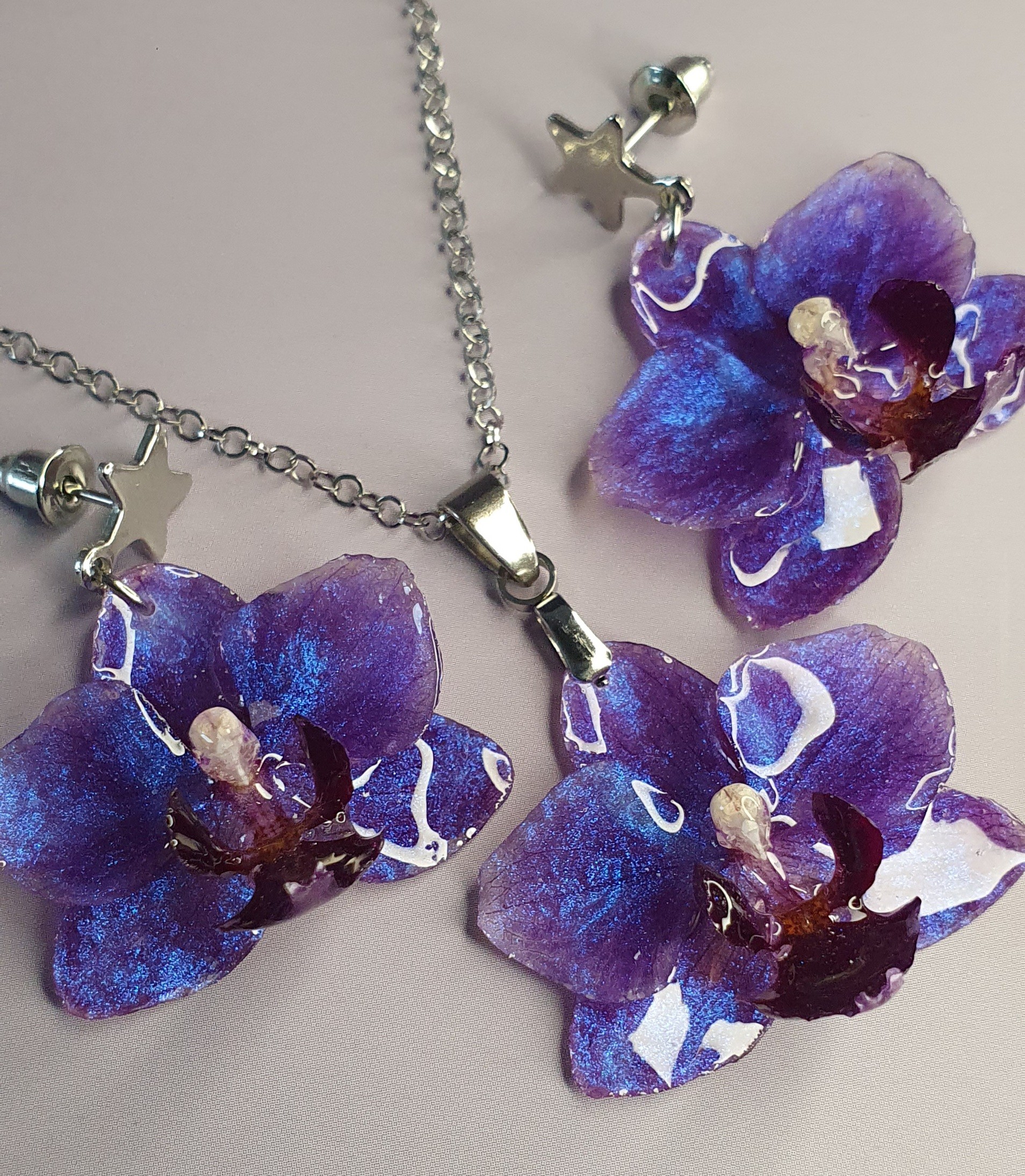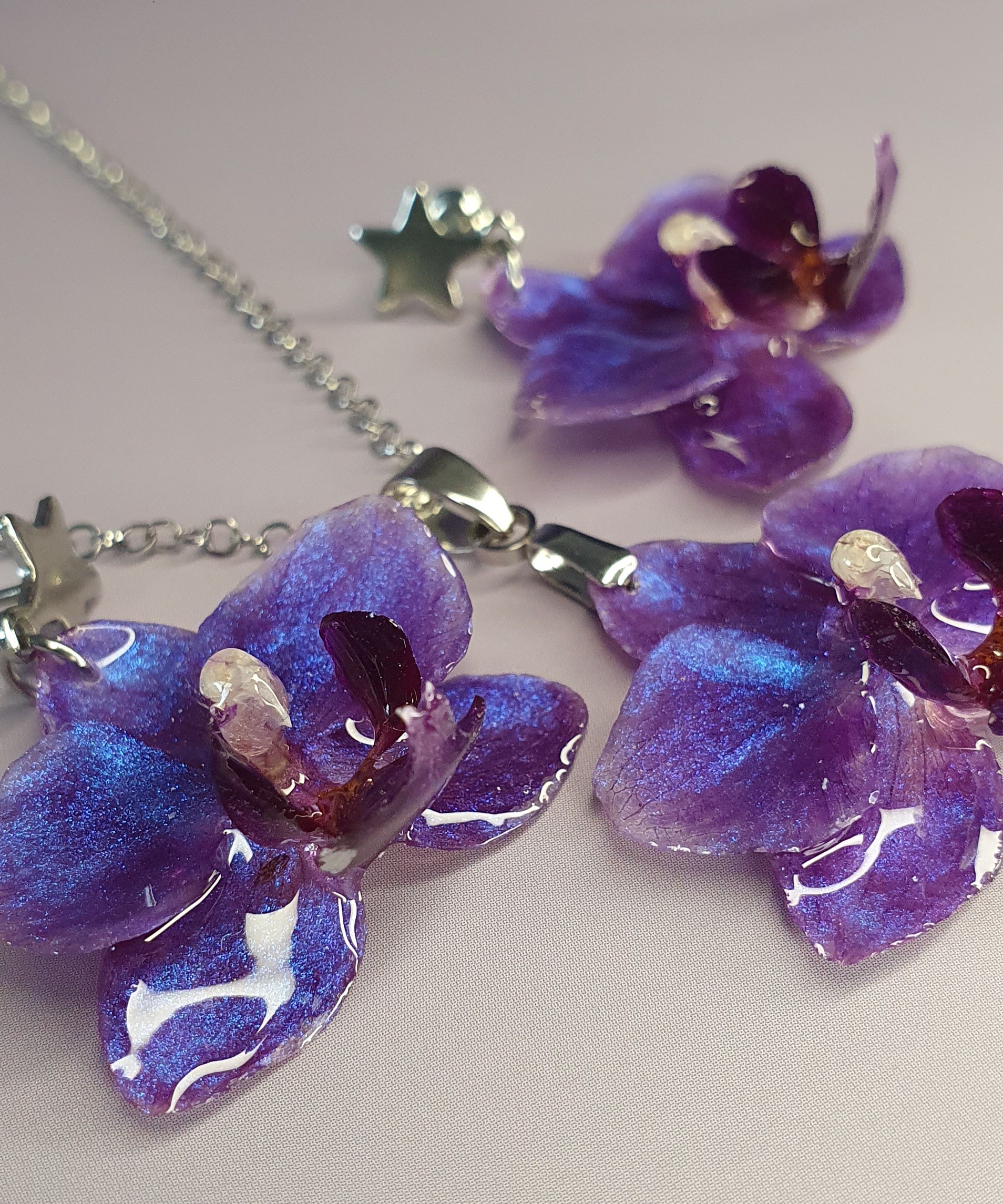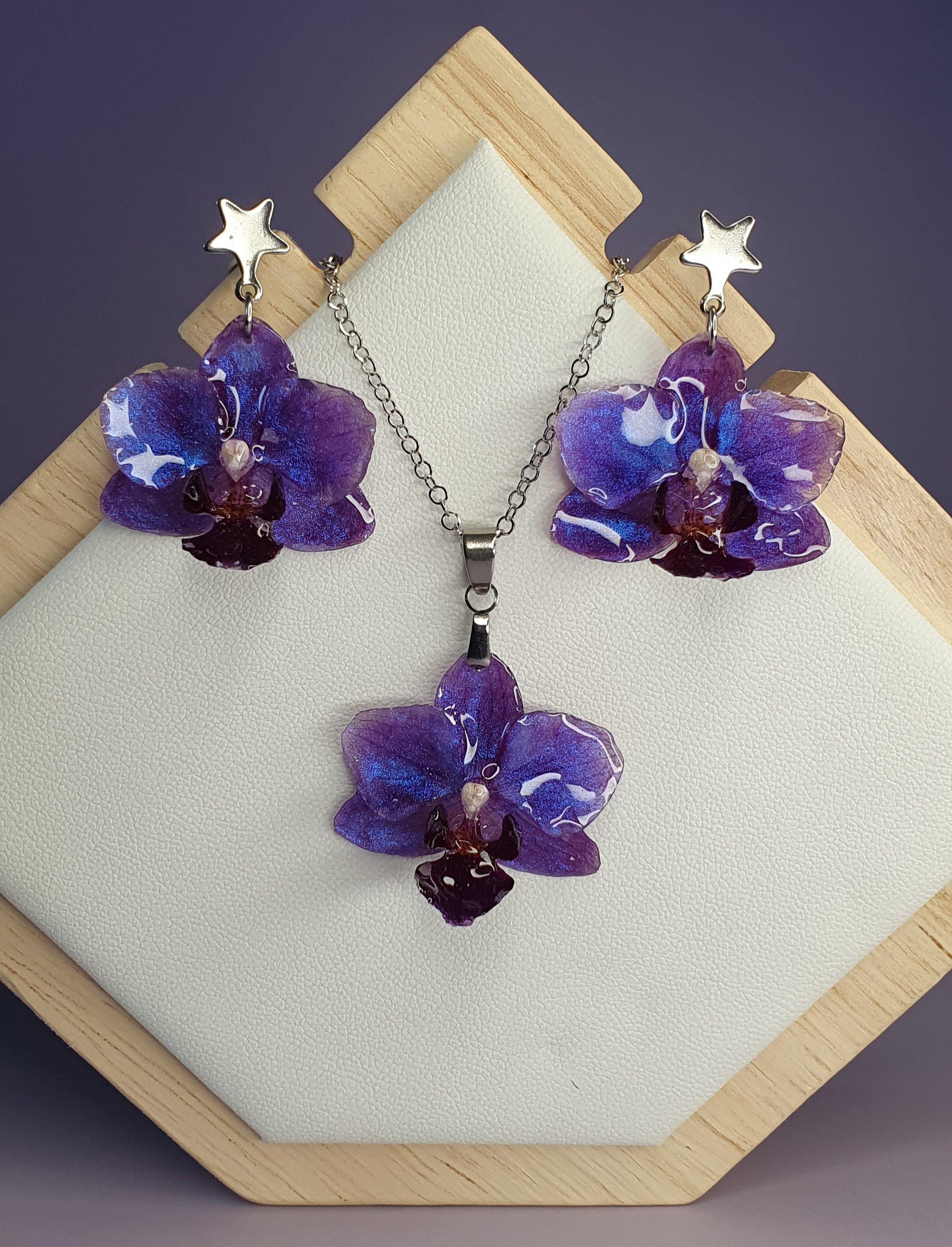Laissez-vous séduire par cette parure exceptionnelle, composée de véritables mini orchidées naturelles, aux teintes violettes profondes et reflets irisés bleus. Chaque fleur, aussi délicate qu’un souffle, a été soigneusement préservée dans une résine cristalline, capturant sa beauté éphémère.