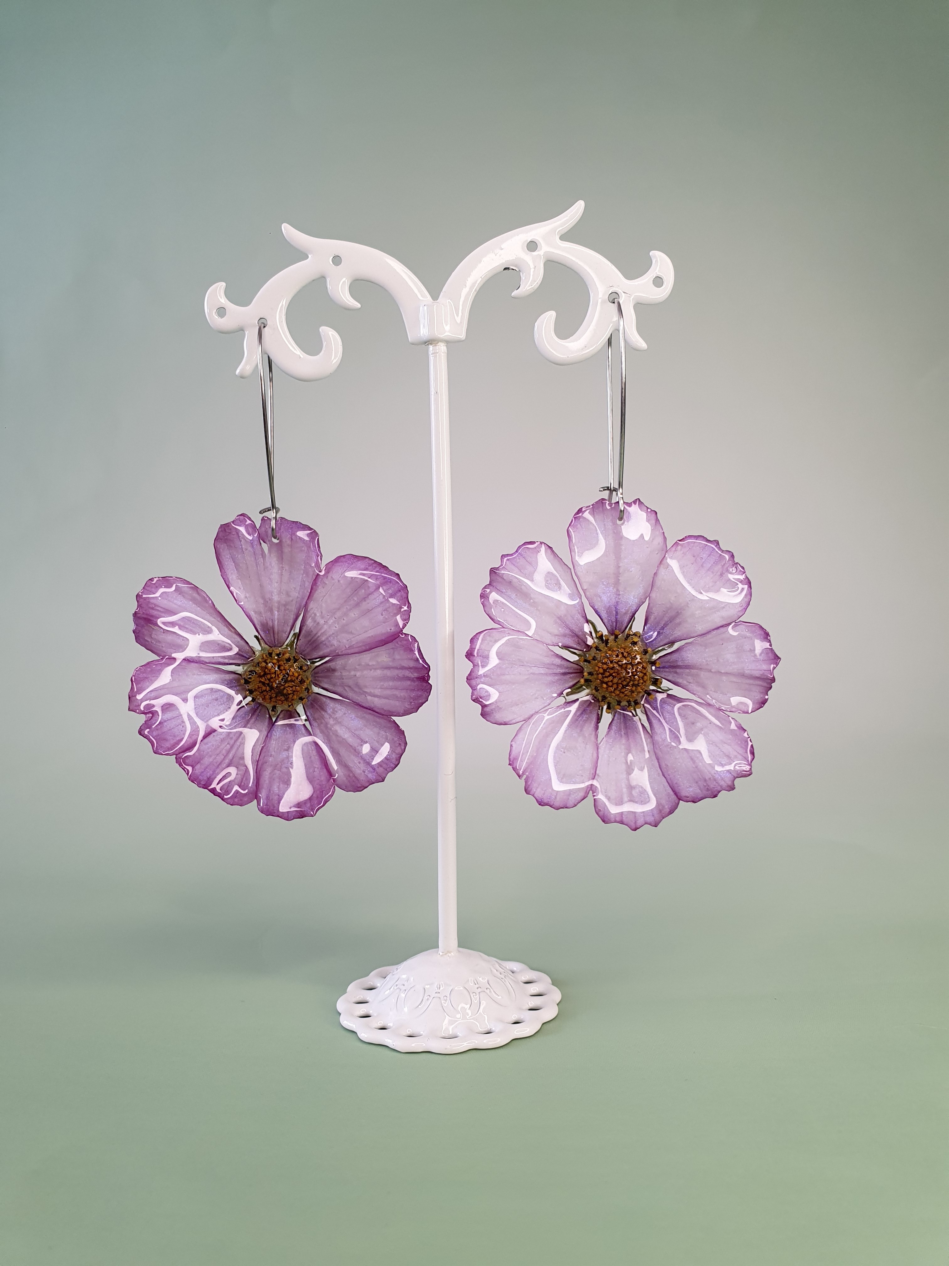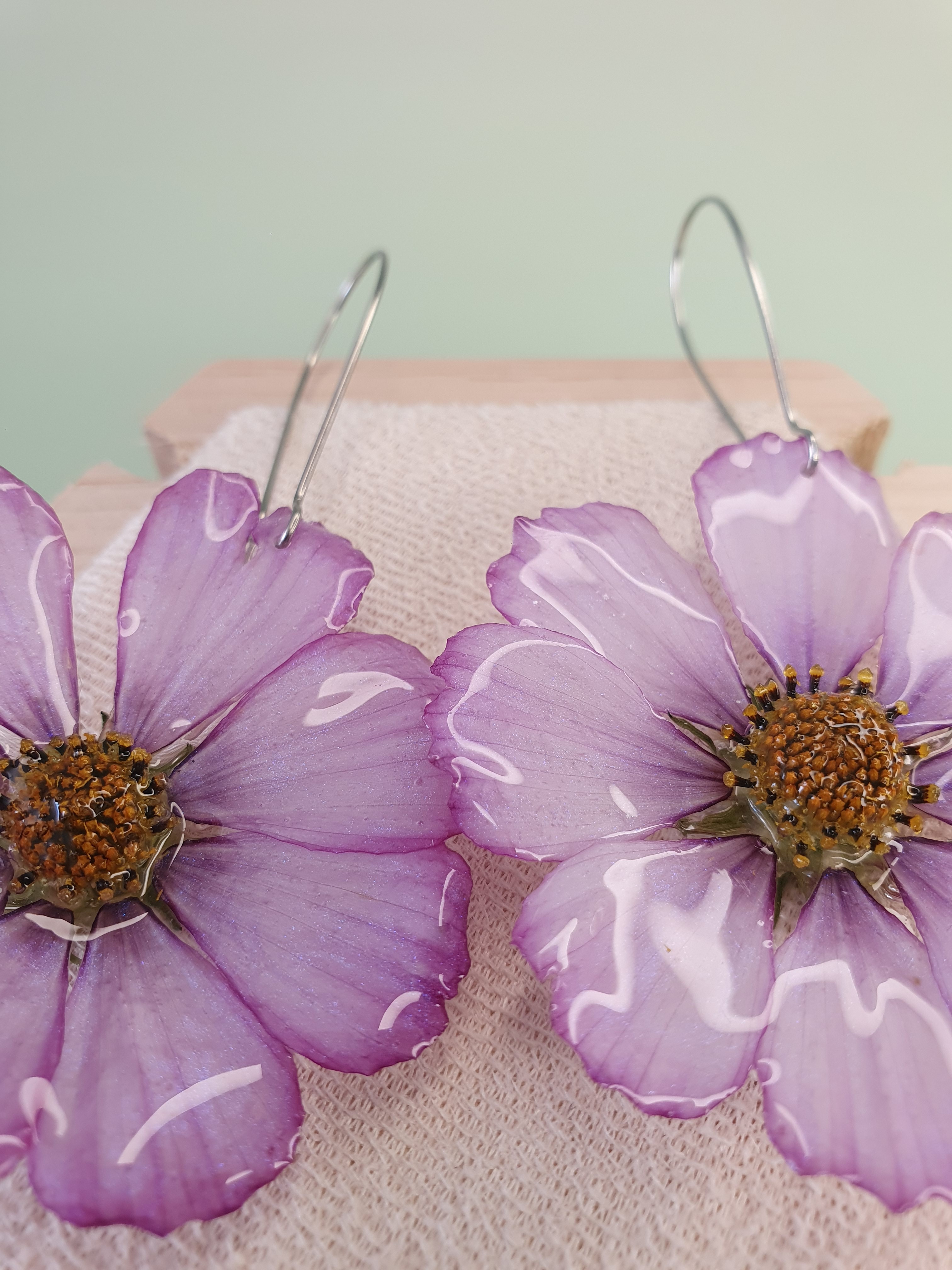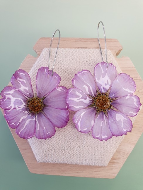 Préparez-vous à faire sensation avec ces boucles d’oreilles spectaculaires, réalisées à partir de véritables fleurs de cosmos dans une teinte rose tendre, aux reflets subtilement irisés. Chaque fleur est soigneusement récoltée, séchée, puis figée dans une résine cristalline qui révèle toute sa finesse et son éclat.