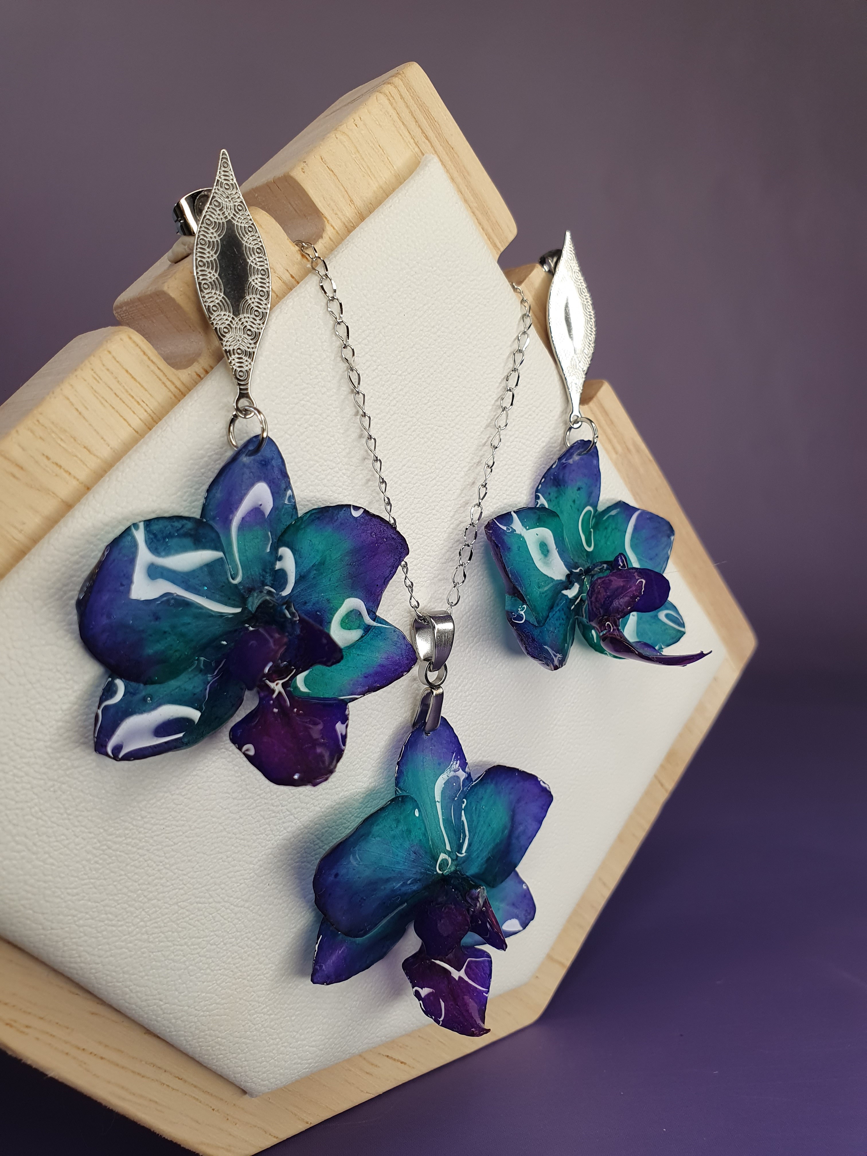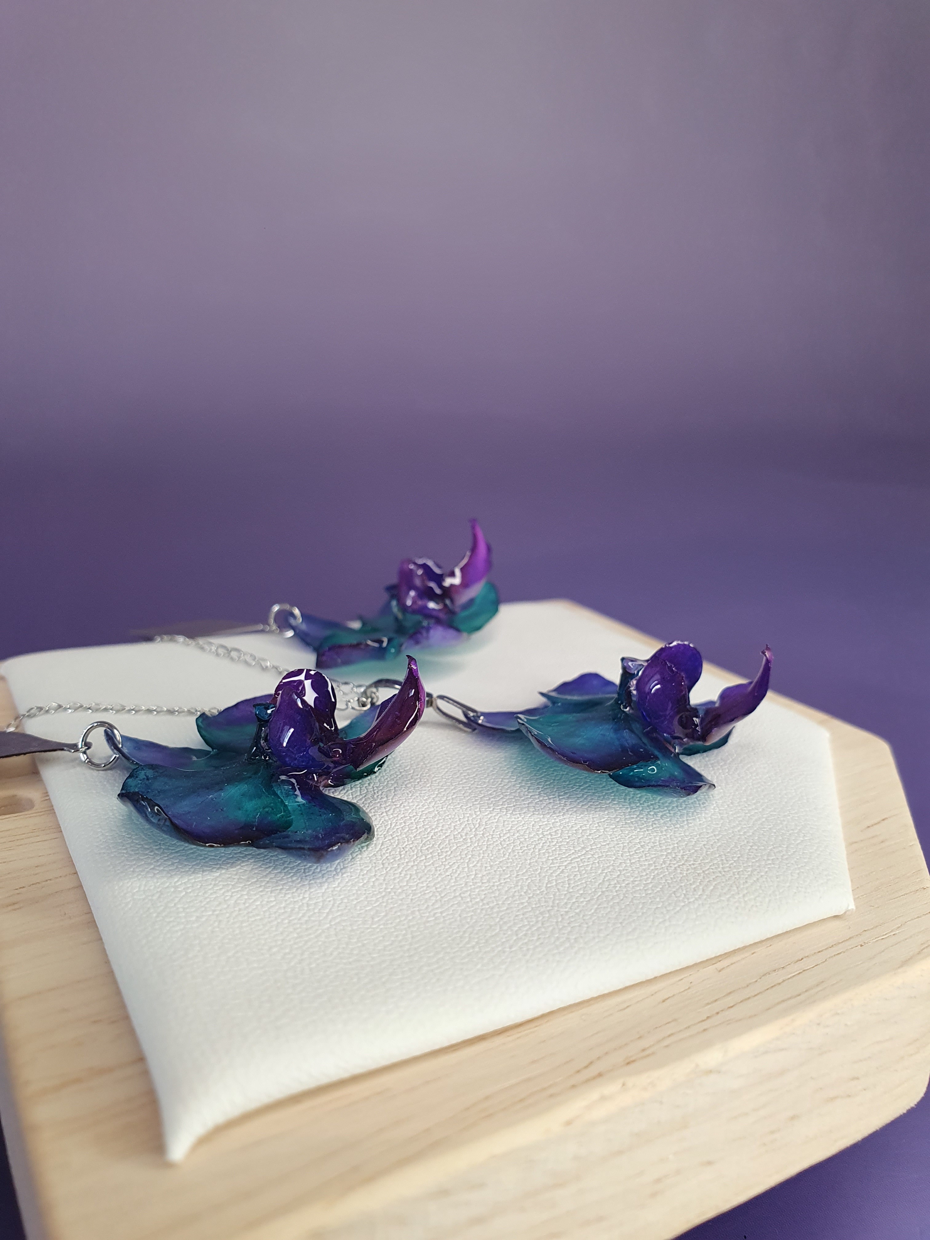 Une création unique réalisée à partir de véritables orchidées, soigneusement récoltées, séchées, peintes puis figées dans la résine pour préserver toute leur finesse naturelle.