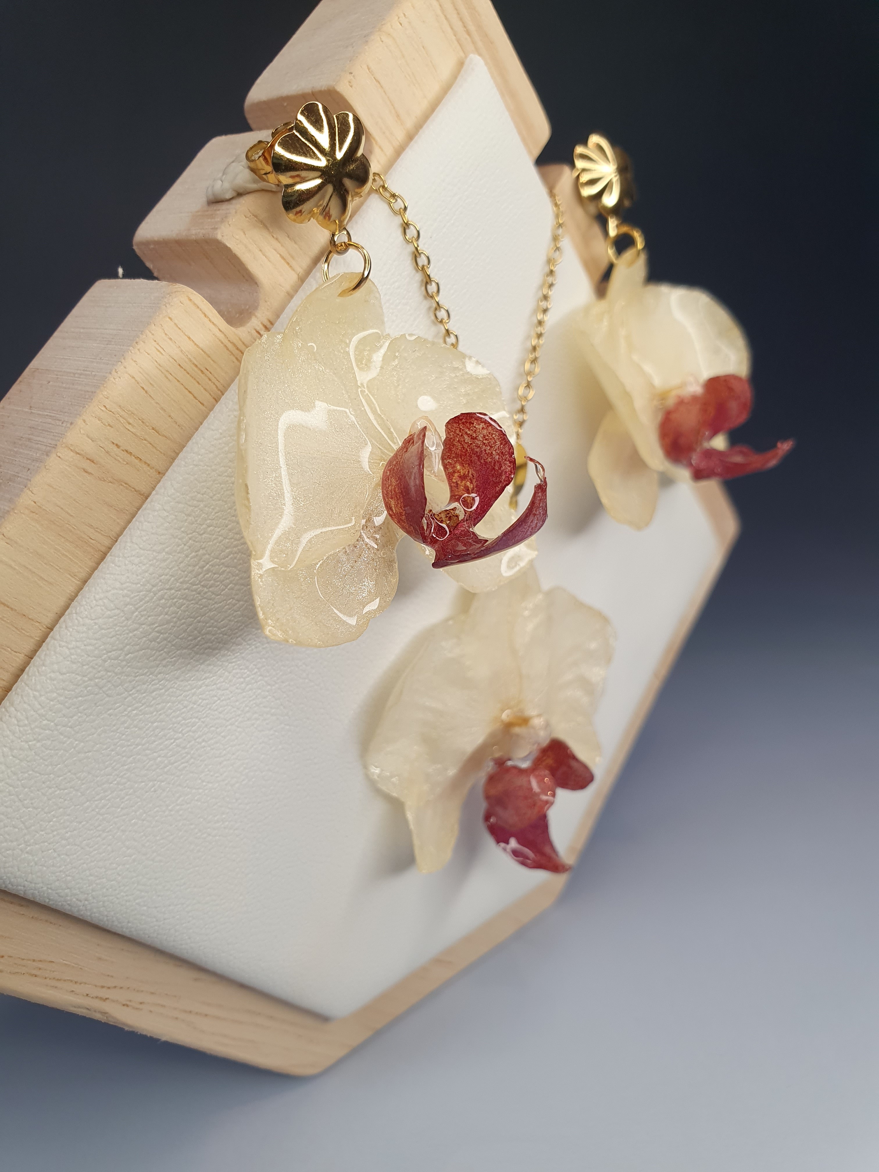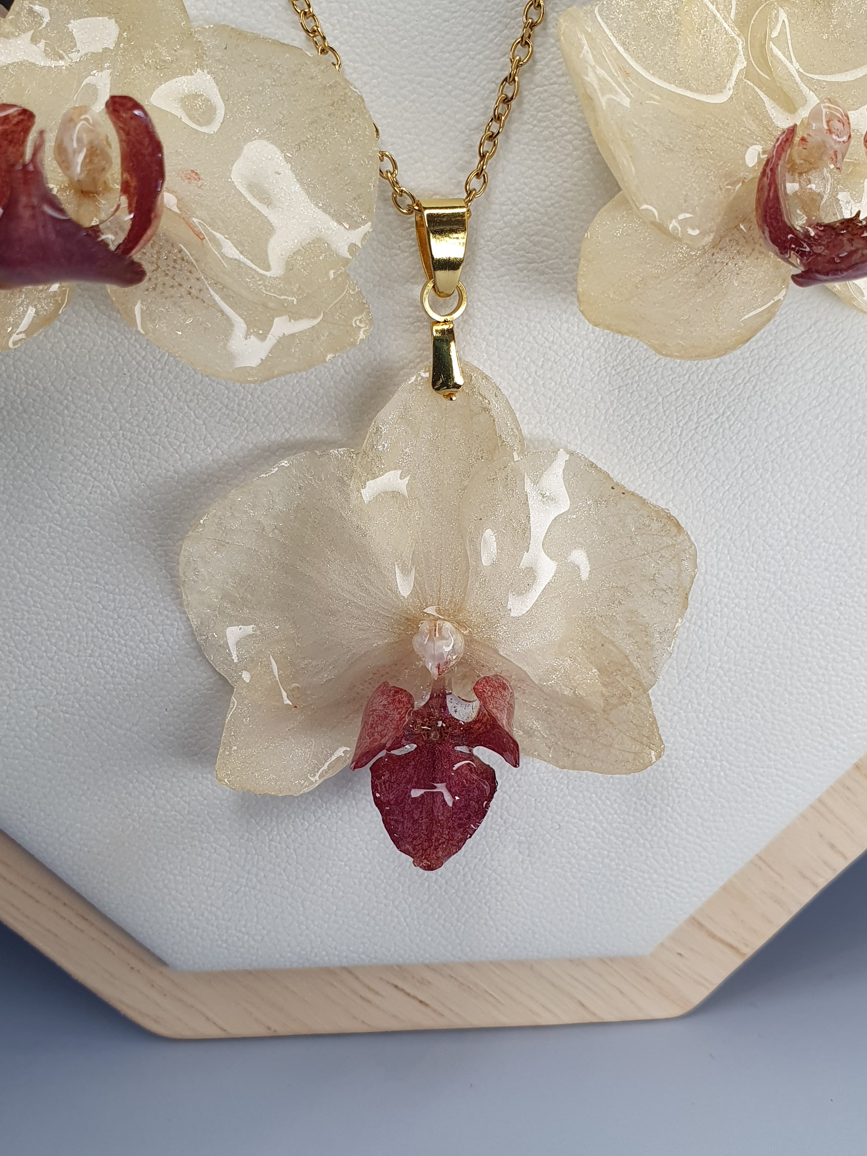 Laissez-vous séduire par cette création douce et lumineuse, réalisée à partir de véritables orchidées que j’ai récoltées, séchées, peintes puis délicatement figées dans la résine pour en préserver toute la grâce naturelle.