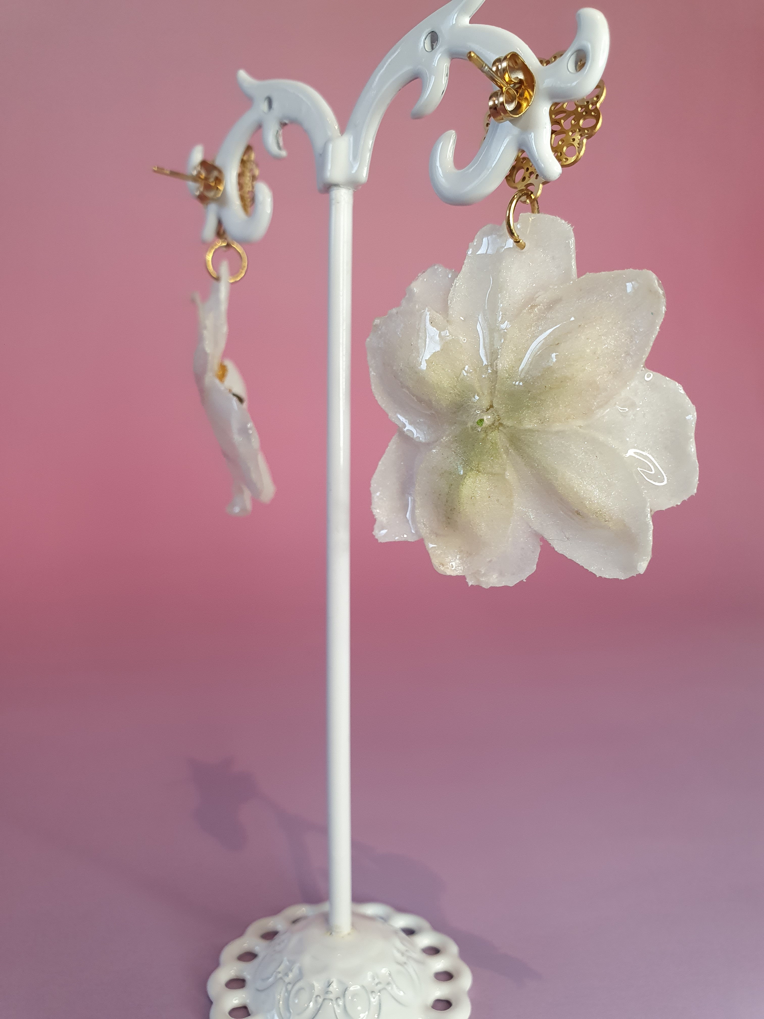 Chaque fleur, soigneusement sélectionnée puis figée dans la résine, révèle un effet nacré doux et lumineux qui met en valeur la finesse naturelle des pétales.