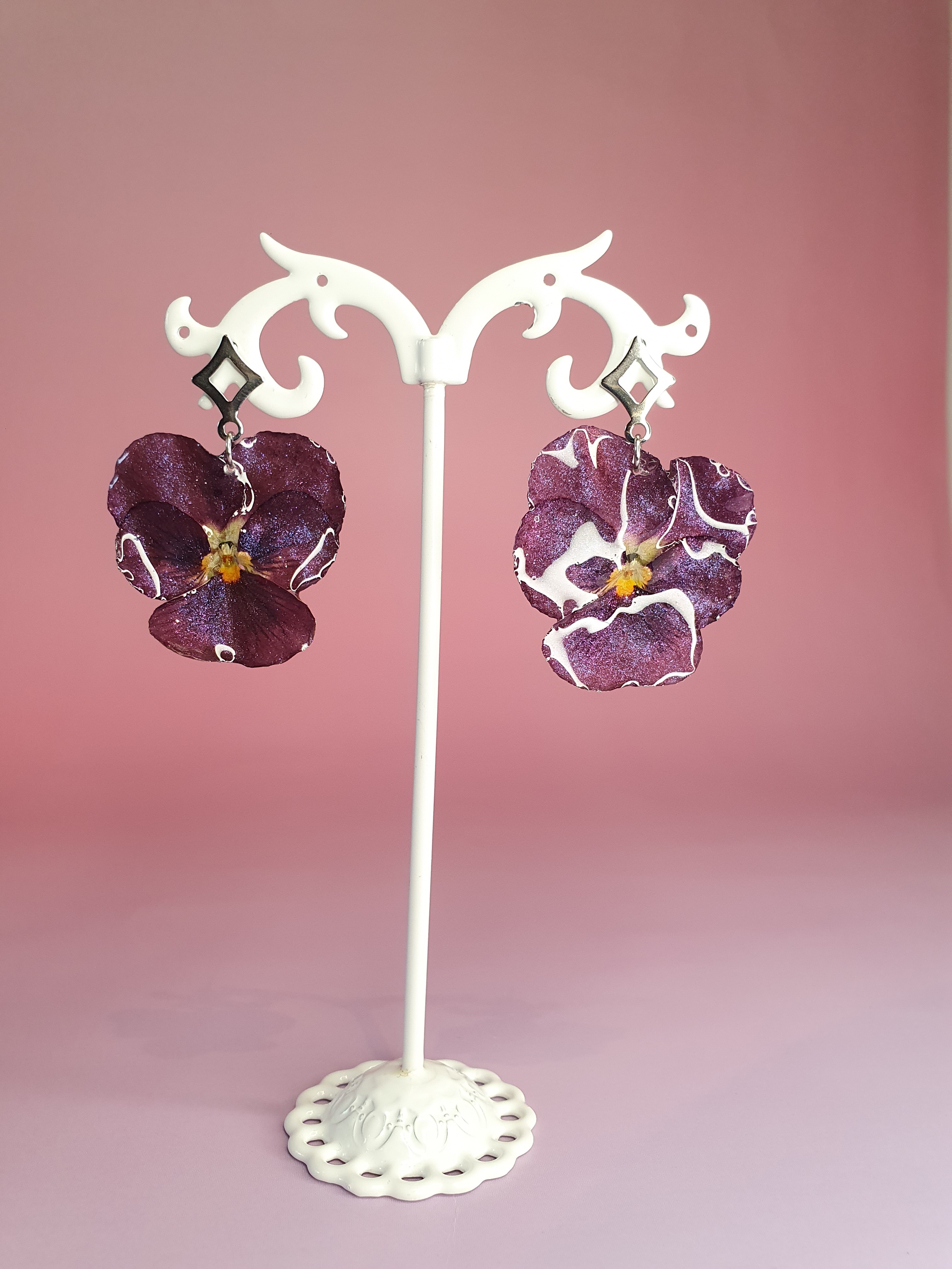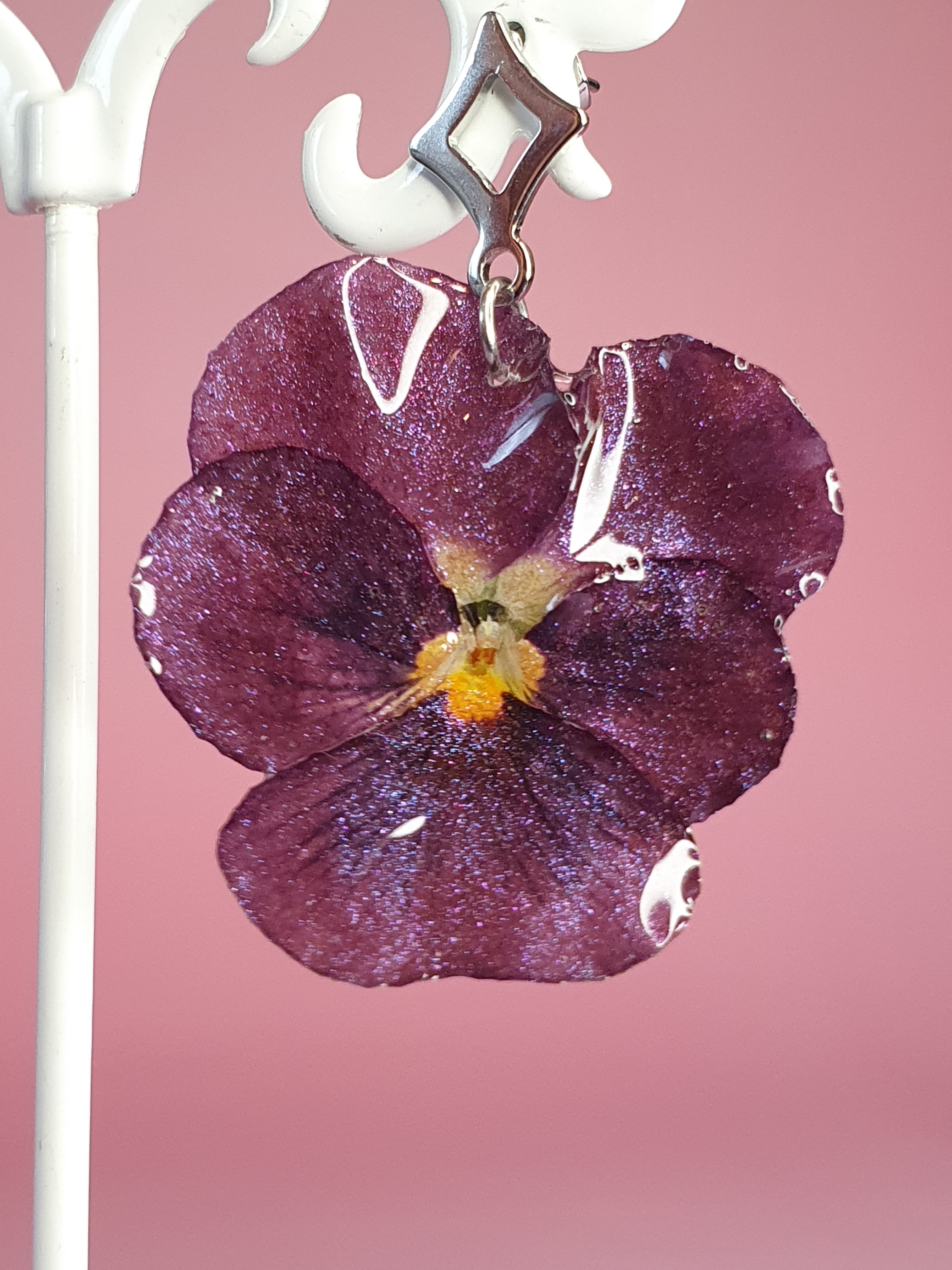 Apportez une touche de poésie à votre tenue avec cette paire de boucles d’oreilles réalisées à partir de véritables fleurs de pensée.