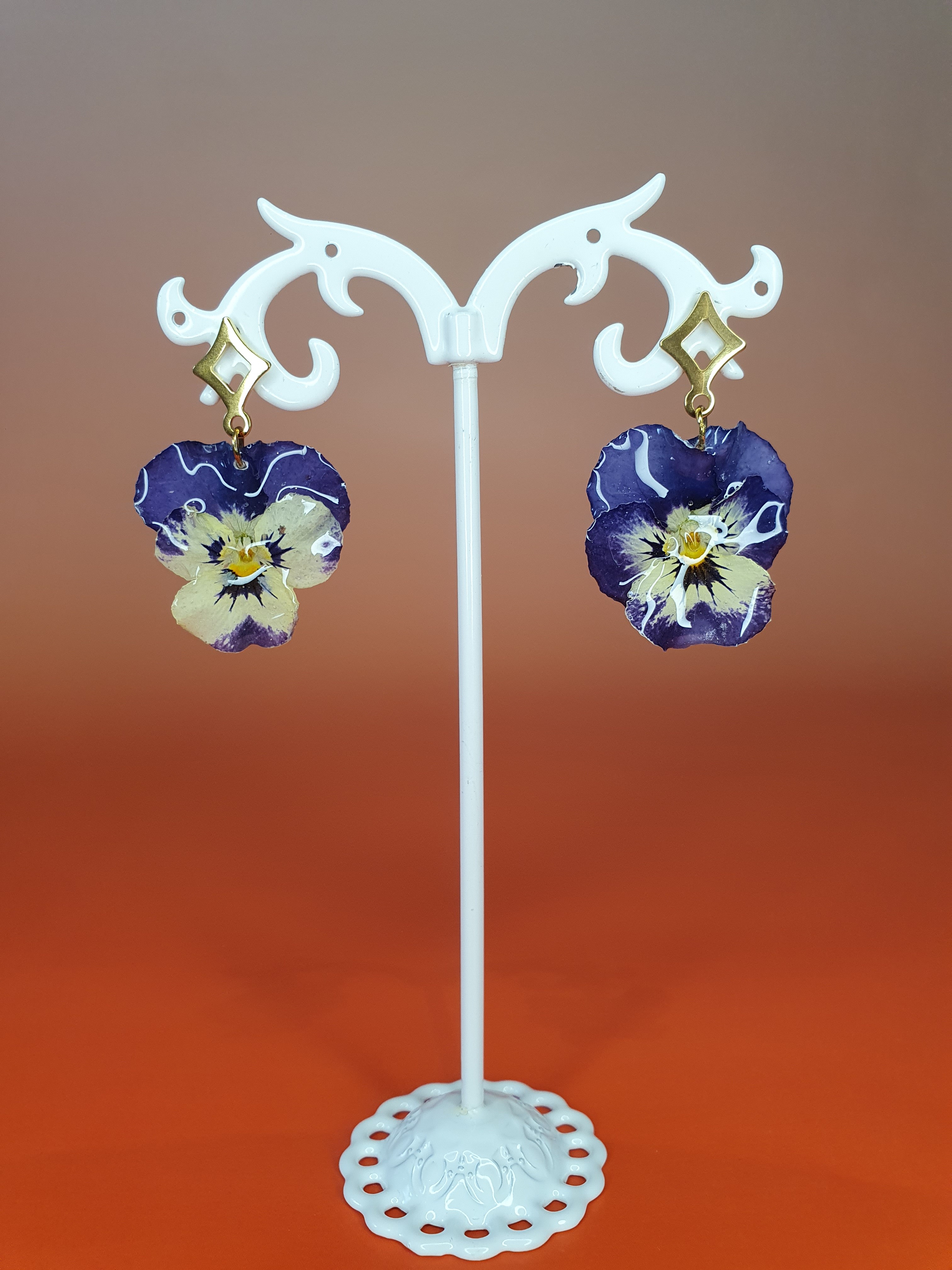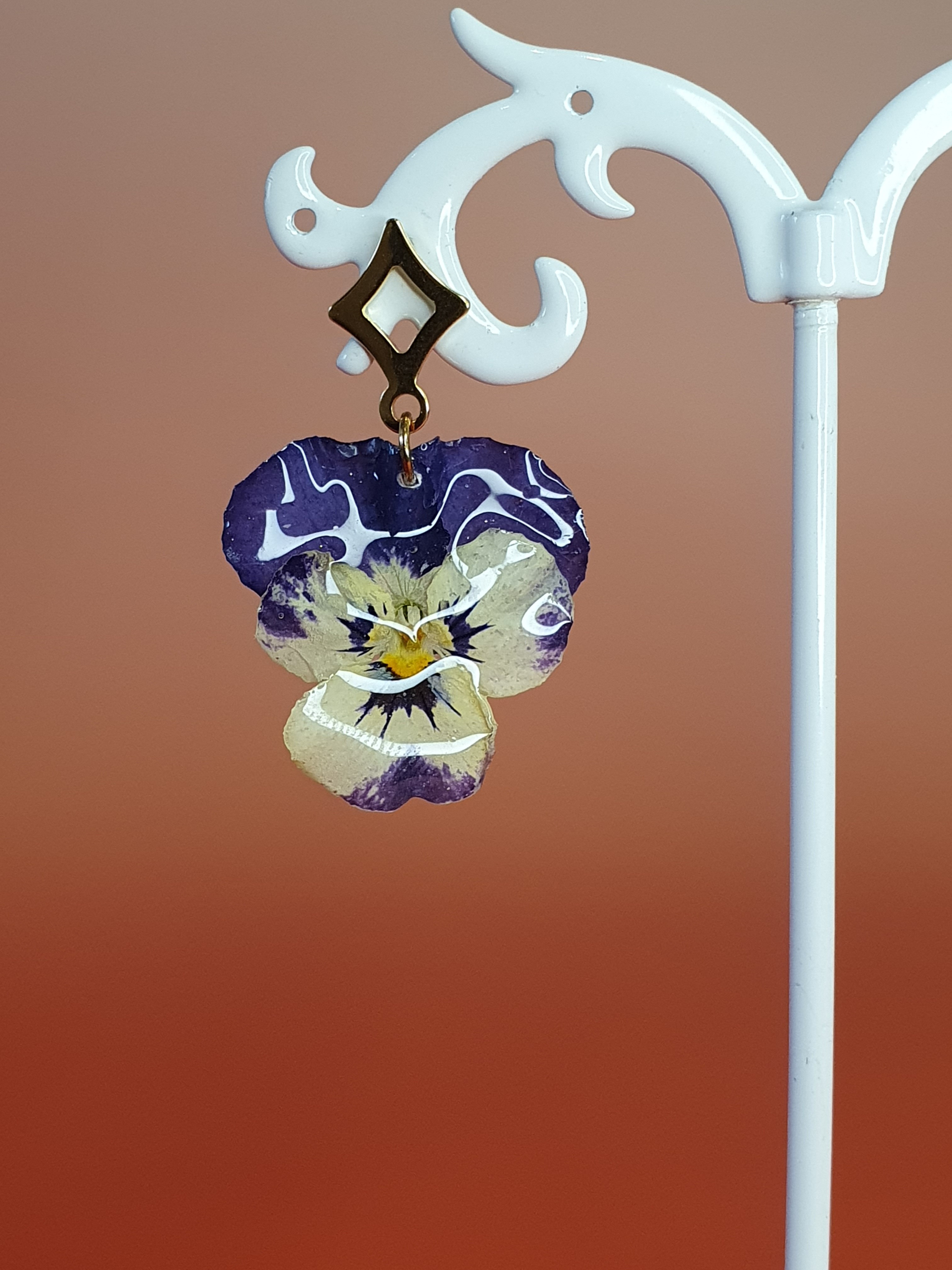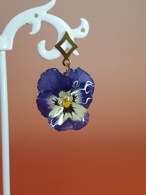 Apportez une touche unique et originale à votre tenue avec cette paire de boucles d’oreilles réalisées à partir de véritables fleurs de pensée.