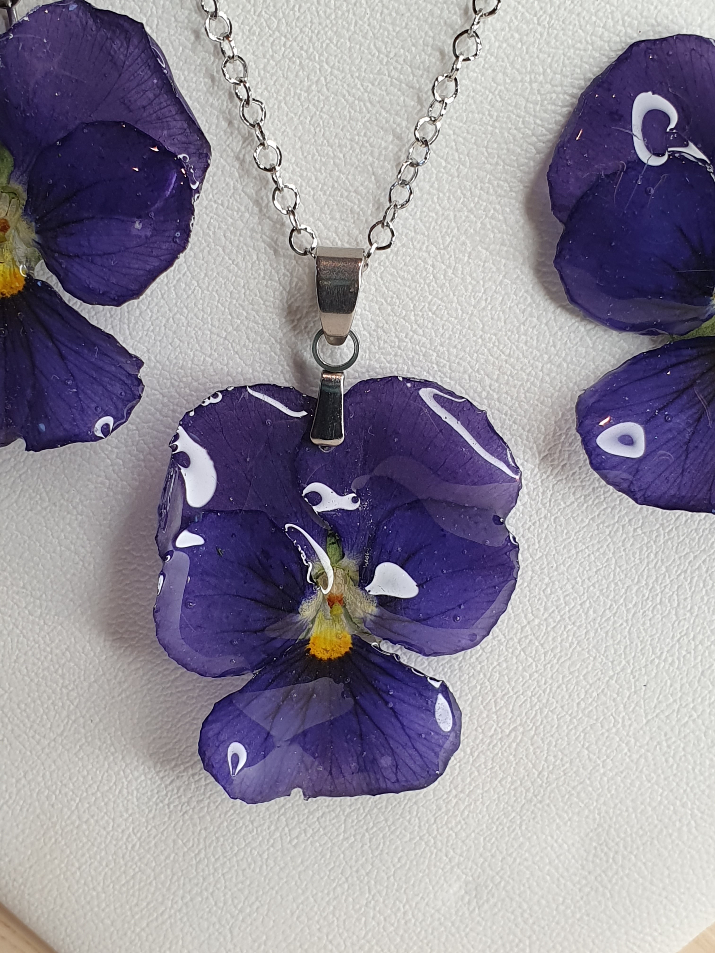 Chaque fleur est soigneusement récoltée et figée dans la résine, mettant en valeur la couleur violette profonde des pétales et le petit cœur jaune, pour un rendu poétique et authentique.