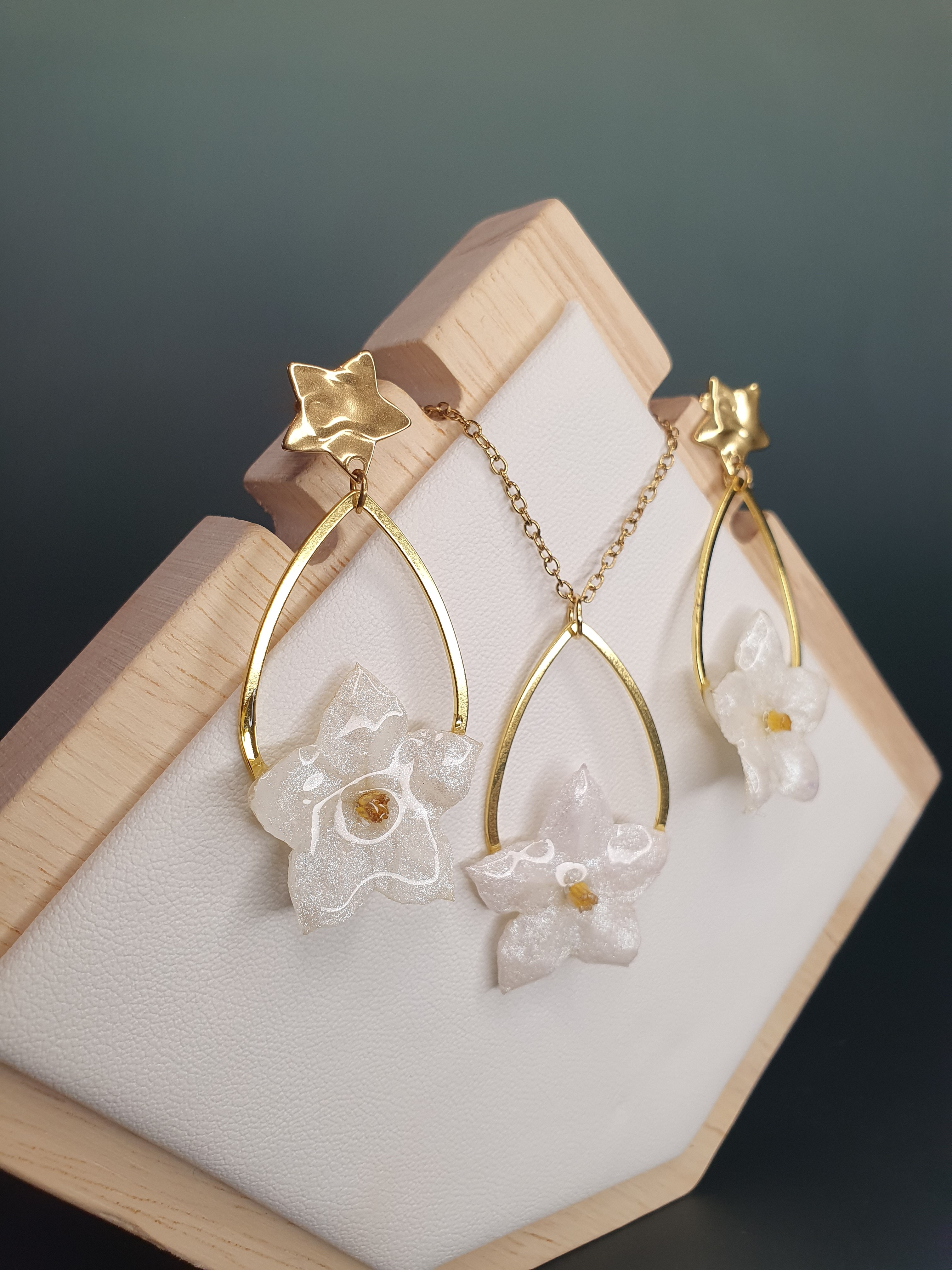 Apportez élégance et raffinement avec cette parure réalisée à partir de véritables fleurs de Morelle, également appelées Faux Jasmin, figées dans la résine pour préserver toute leur délicatesse.