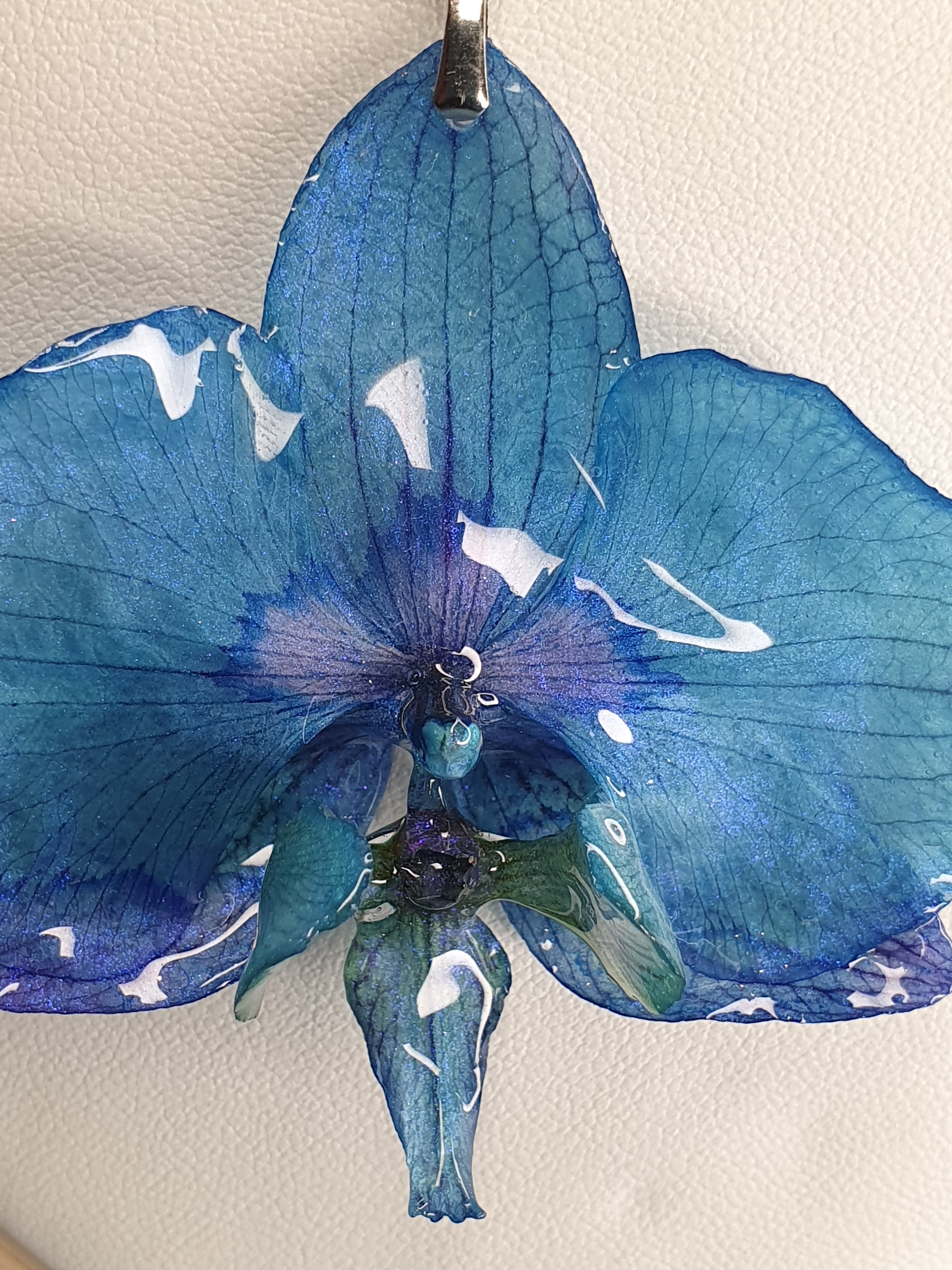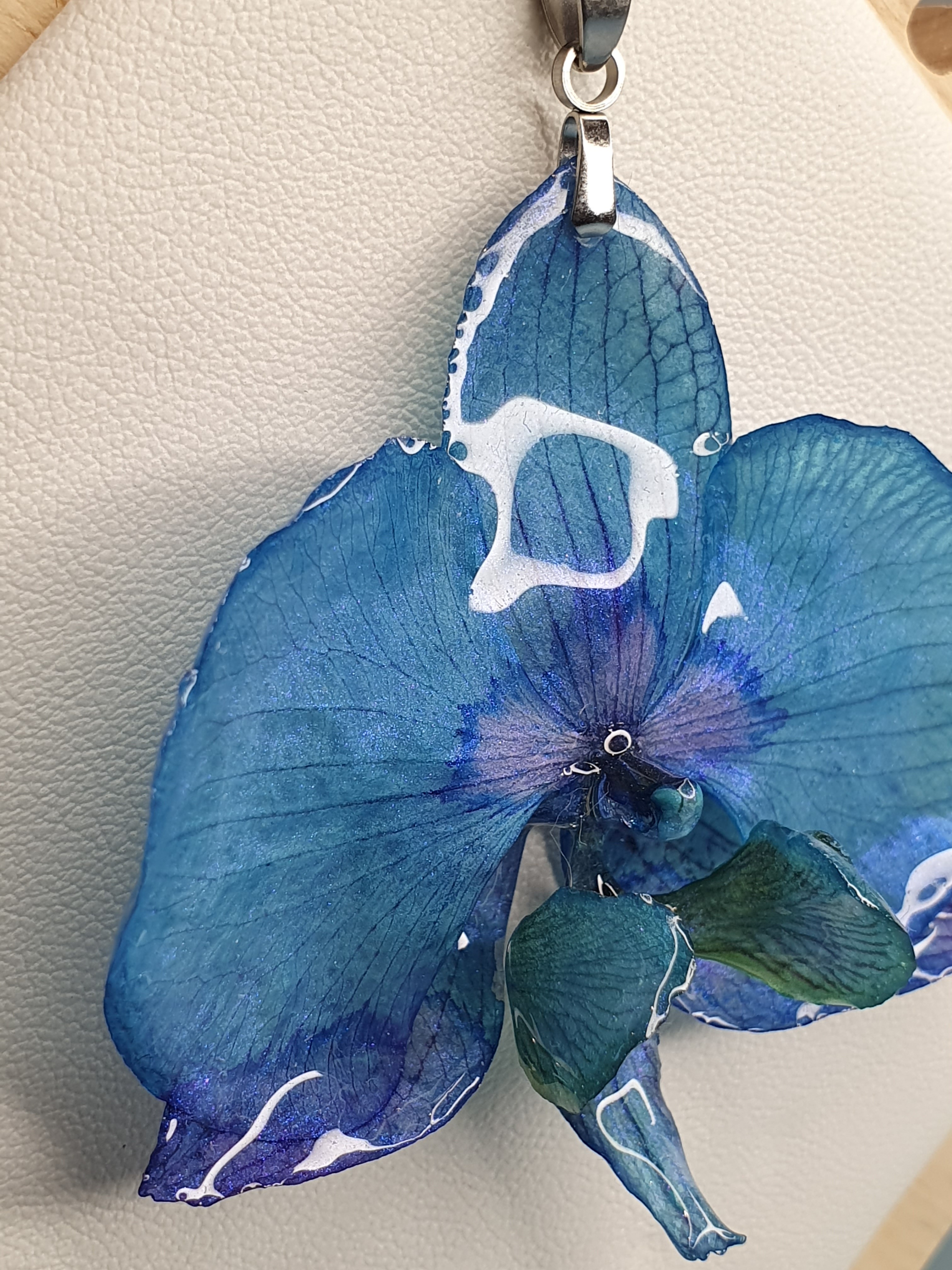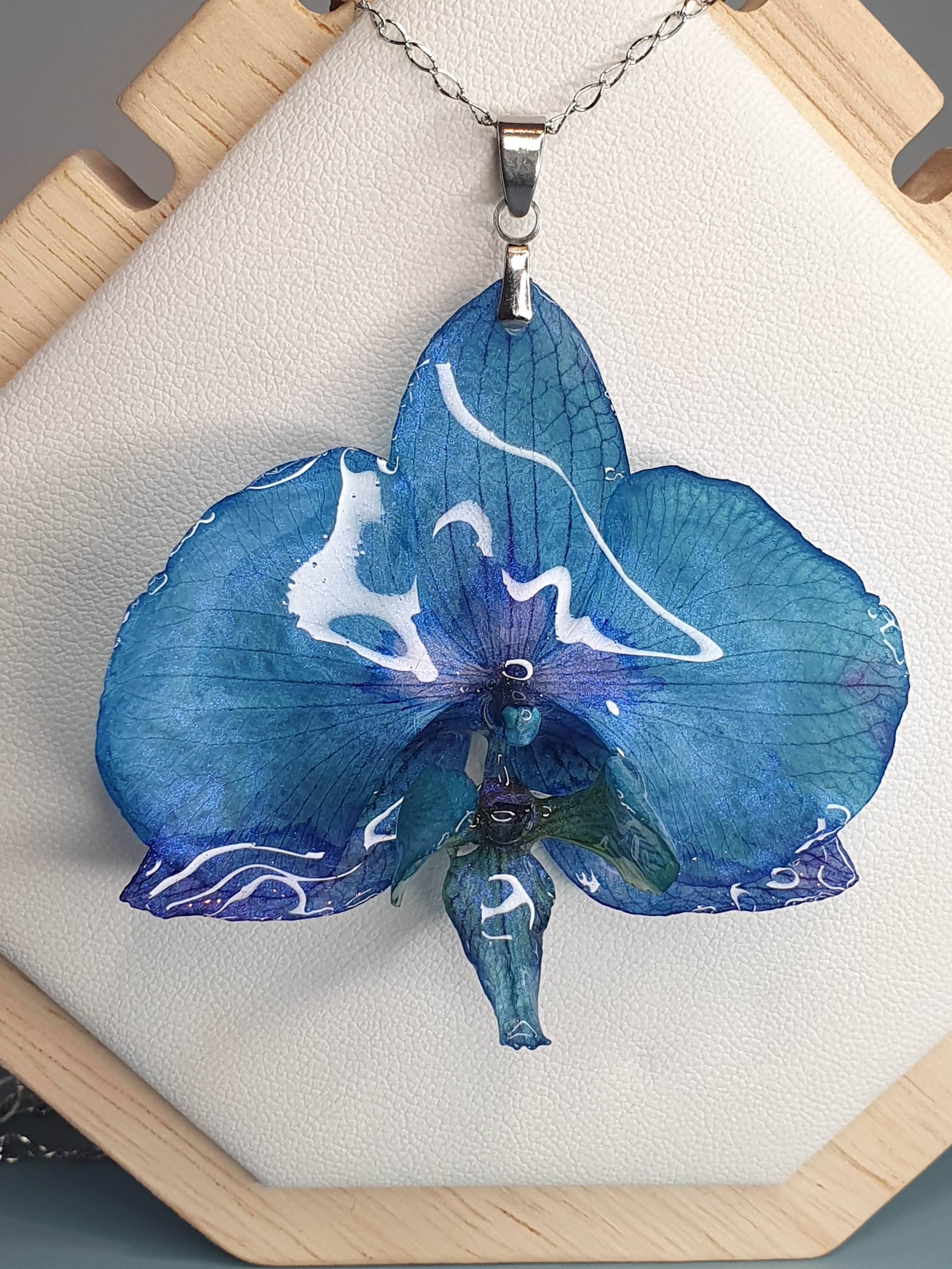 Sublimez votre style avec ce collier orné d’une grande orchidée véritable, teintée dans différentes nuances de bleu avec les veines naturelles de la fleur mises en valeur.
