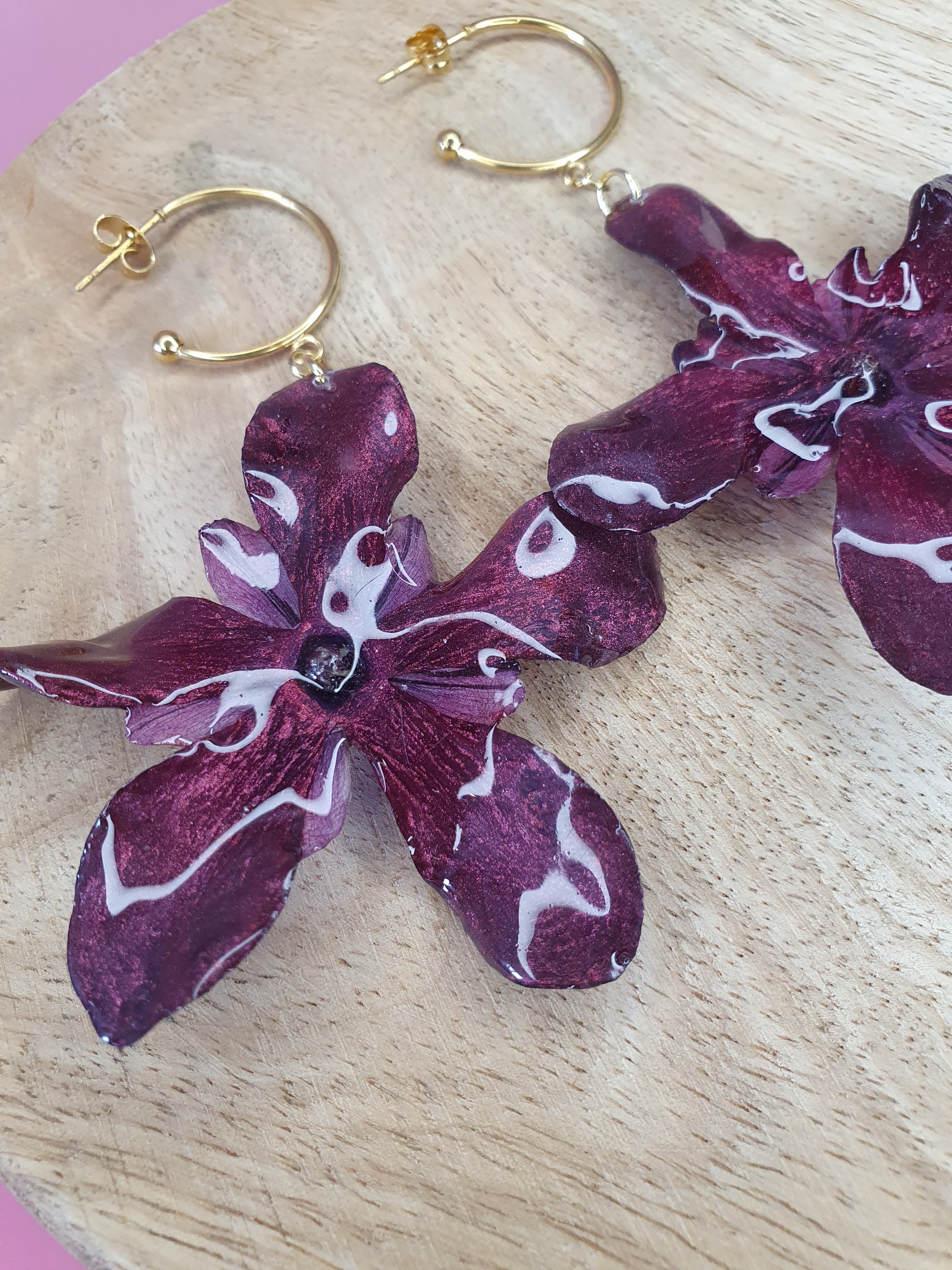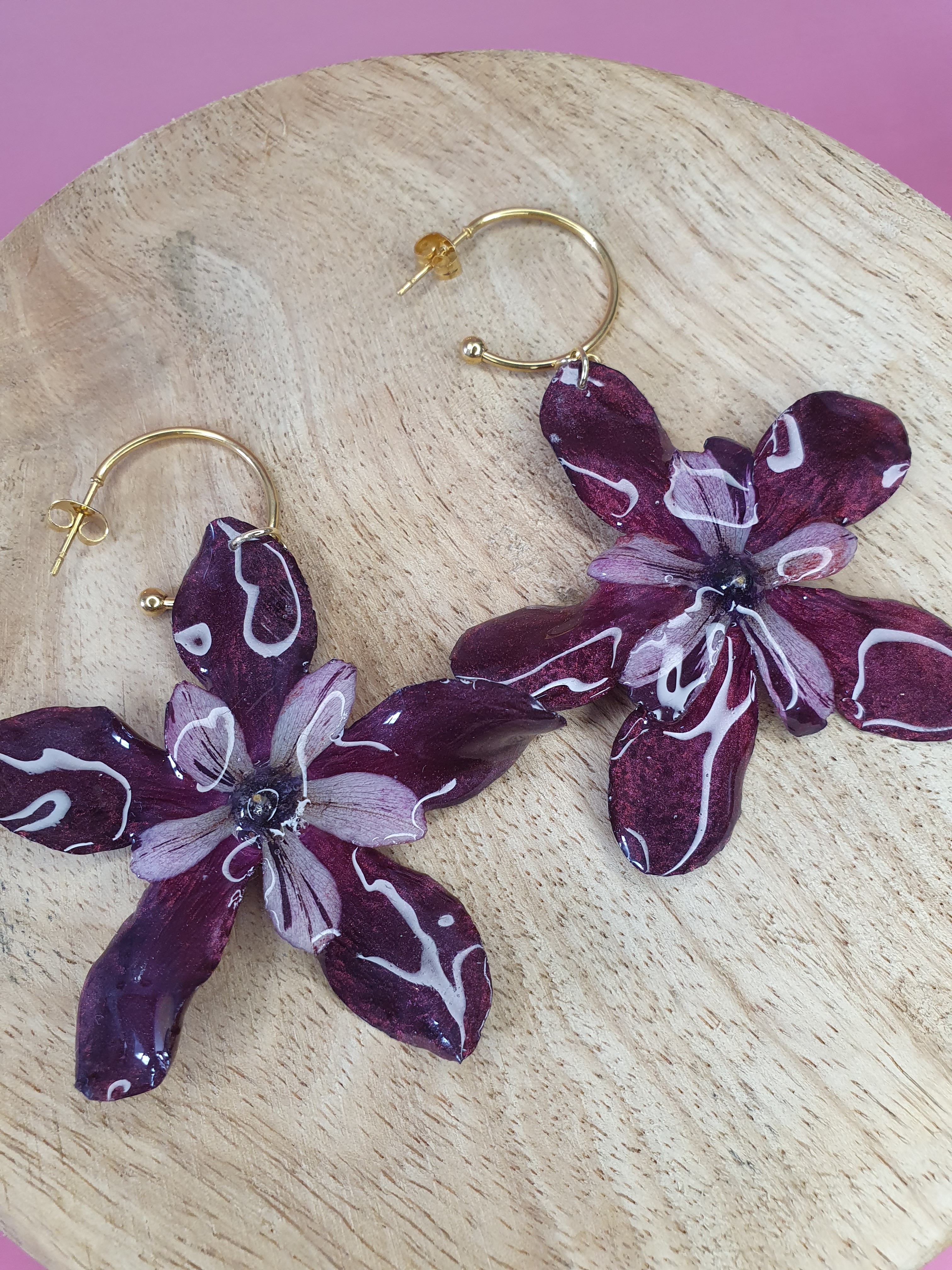 Apportez profondeur et raffinement à votre look avec ces boucles d’oreilles Cyclamen bordeaux aux reflets prune. Fleurs naturelles figées dans la résine, montées sur inox doré pour un éclat subtil et chic.