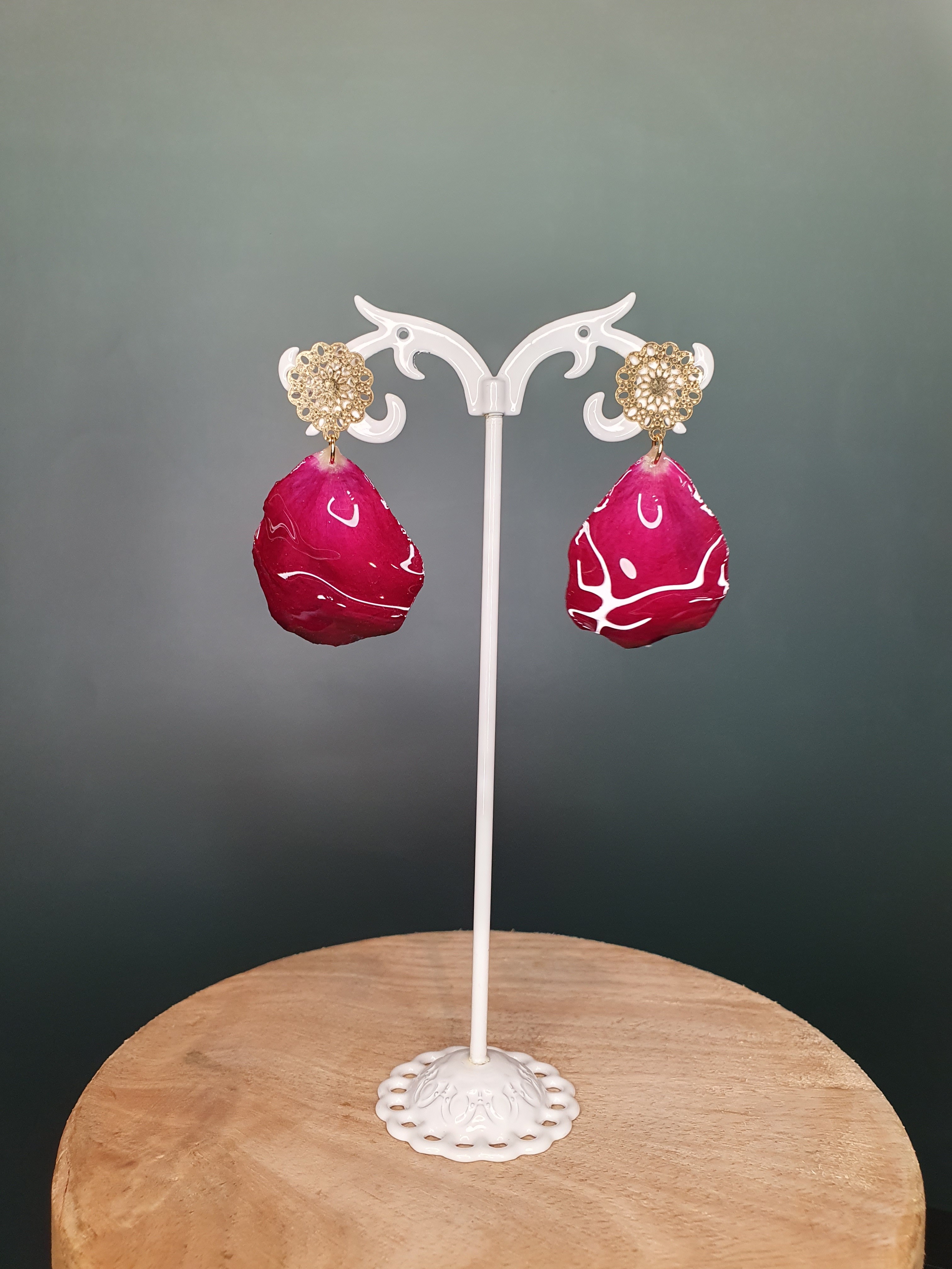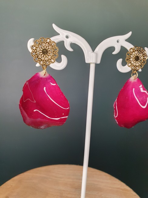 Paire de boucles d’oreilles artisanales réalisée à partir de véritables pétales de rose rouge, figés en résine pour une finition légère et élégante.