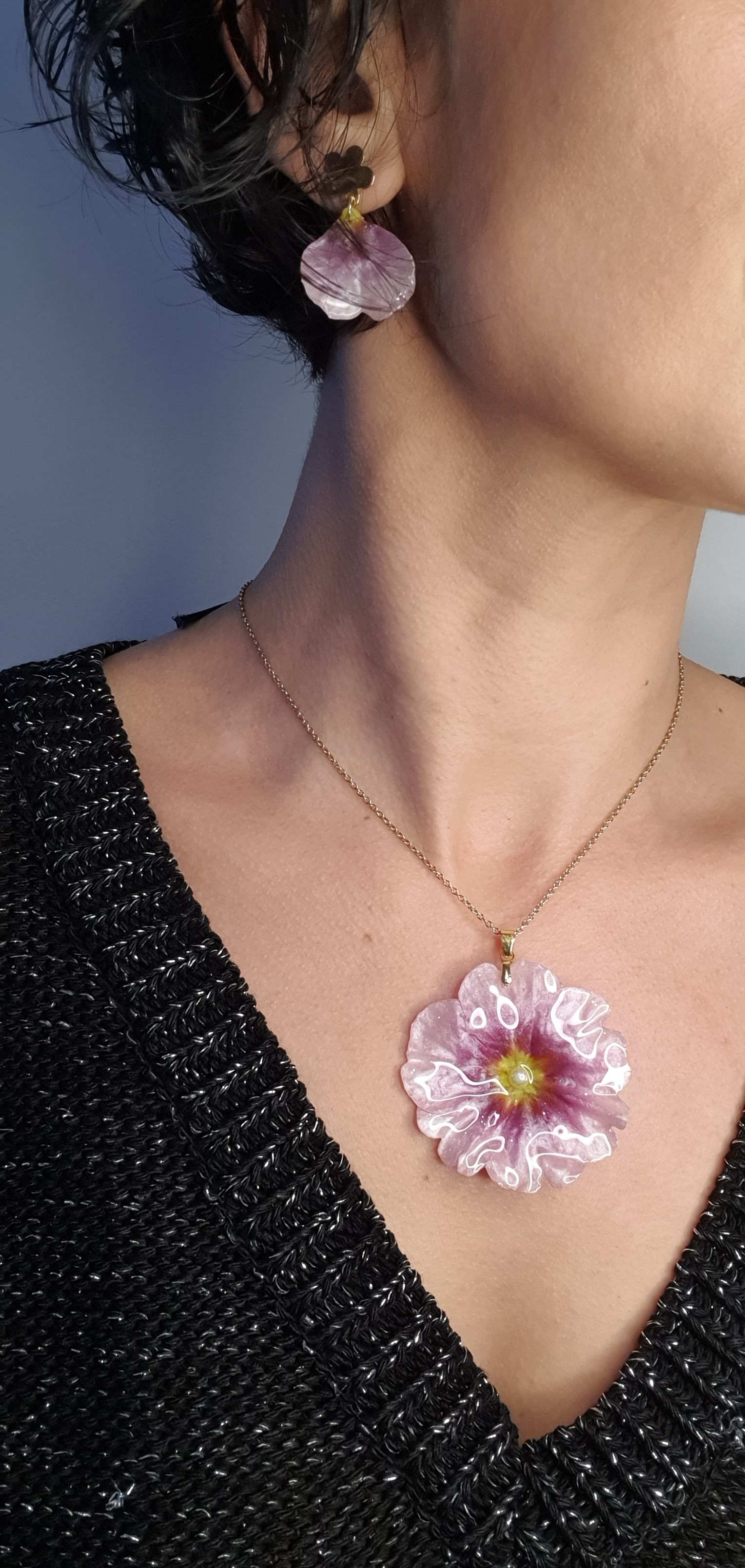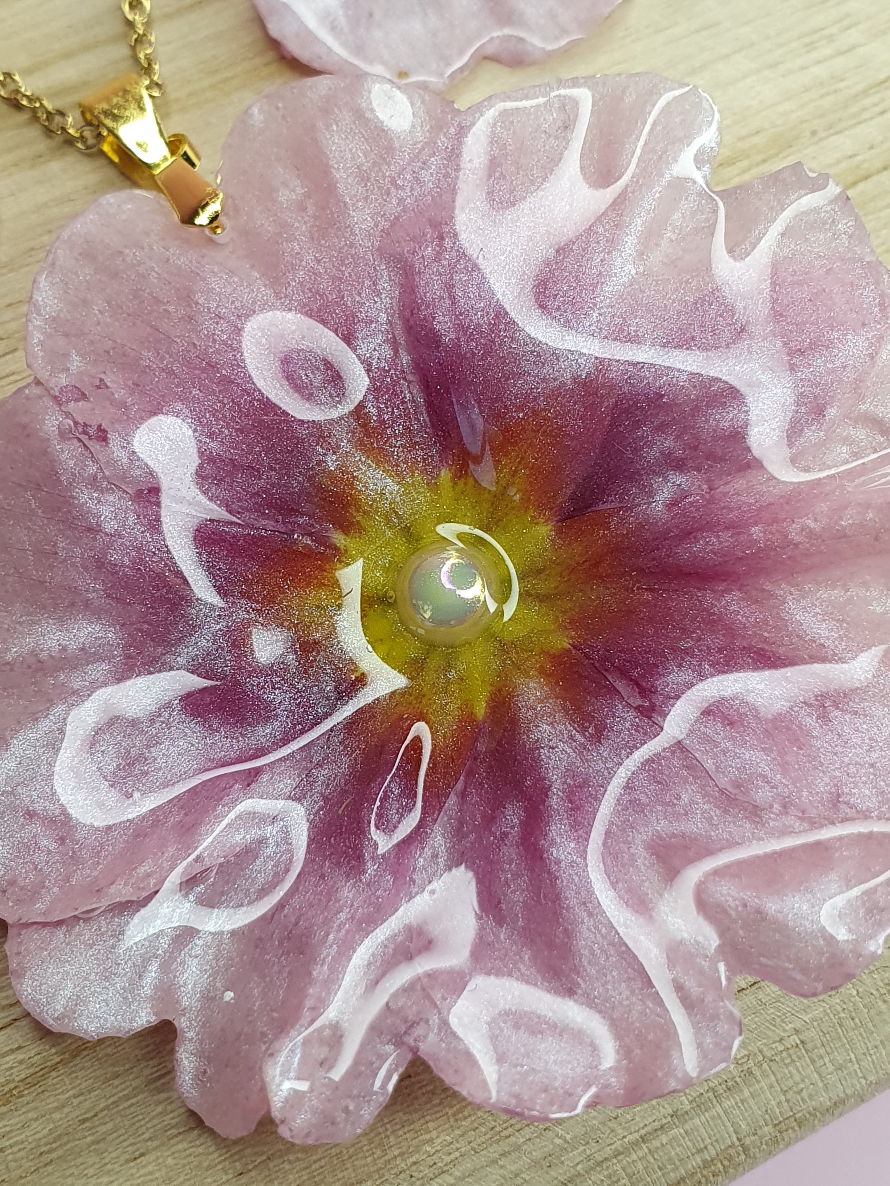 Une véritable primevère rose, récoltée avec soin, puis séchée et délicatement figée dans une résine rose poudré, pour capturer sa beauté pour toujours.