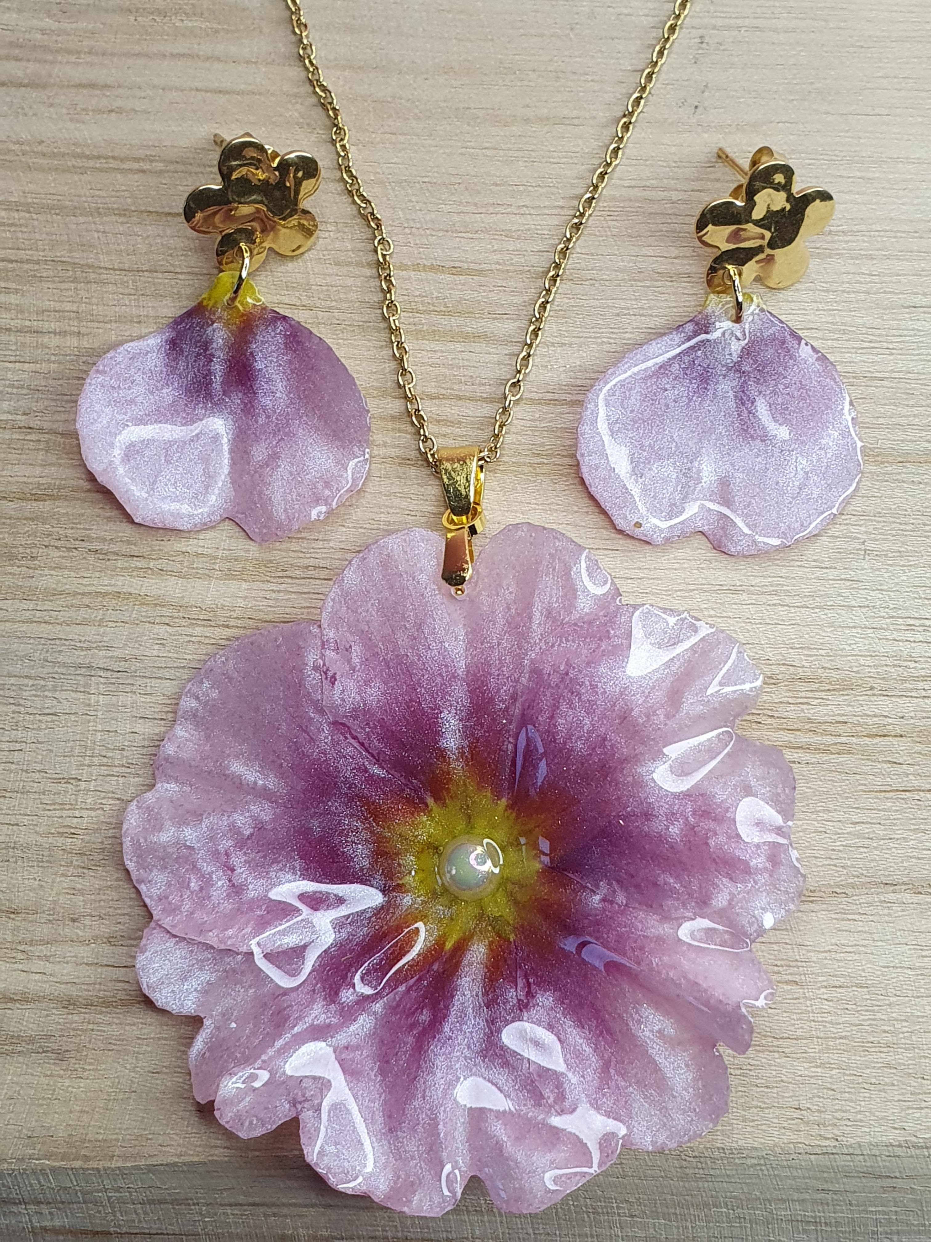 🌸 Parure Primevère Rose – Fleur Véritable & Résine Rose Poudré