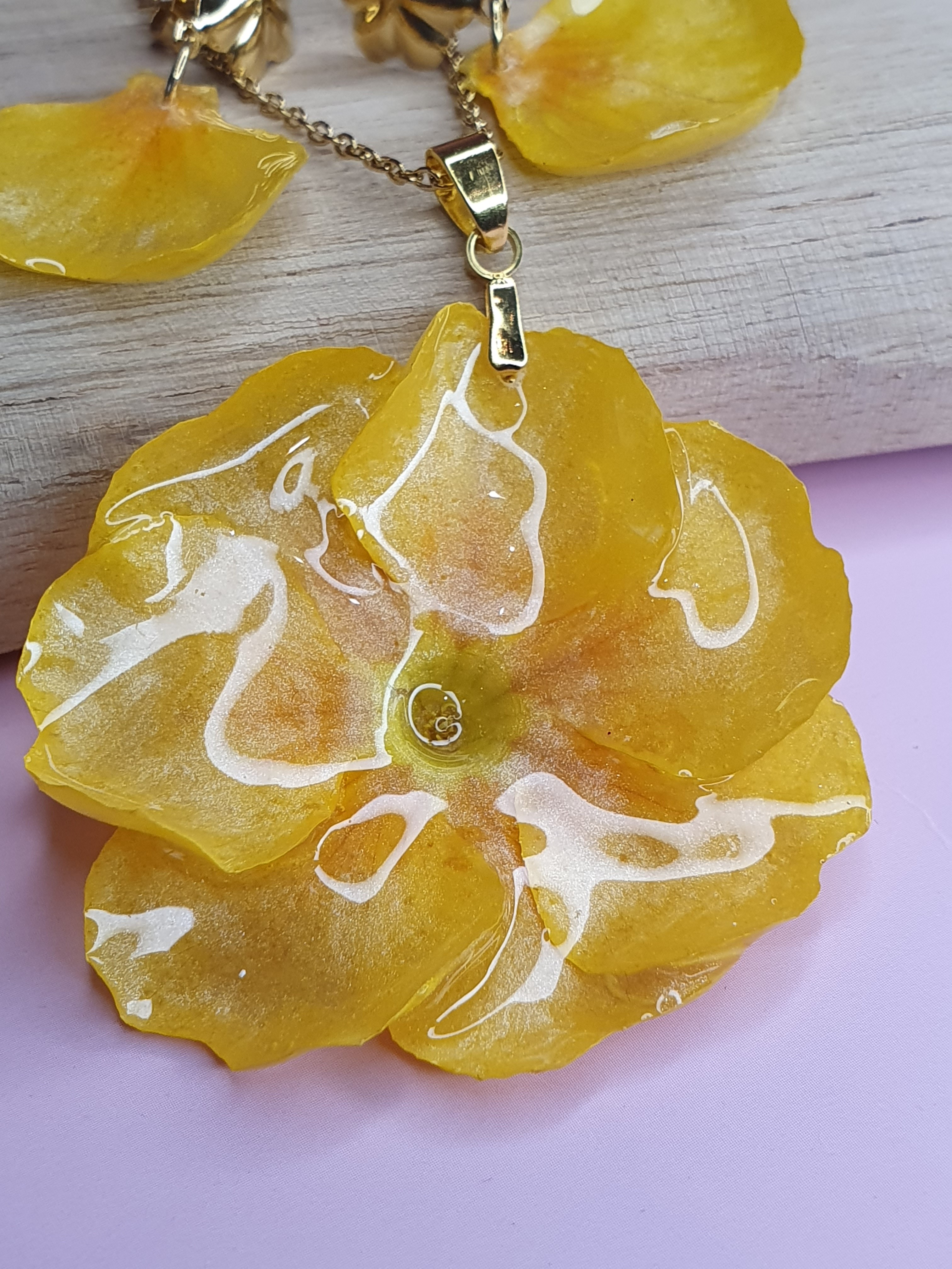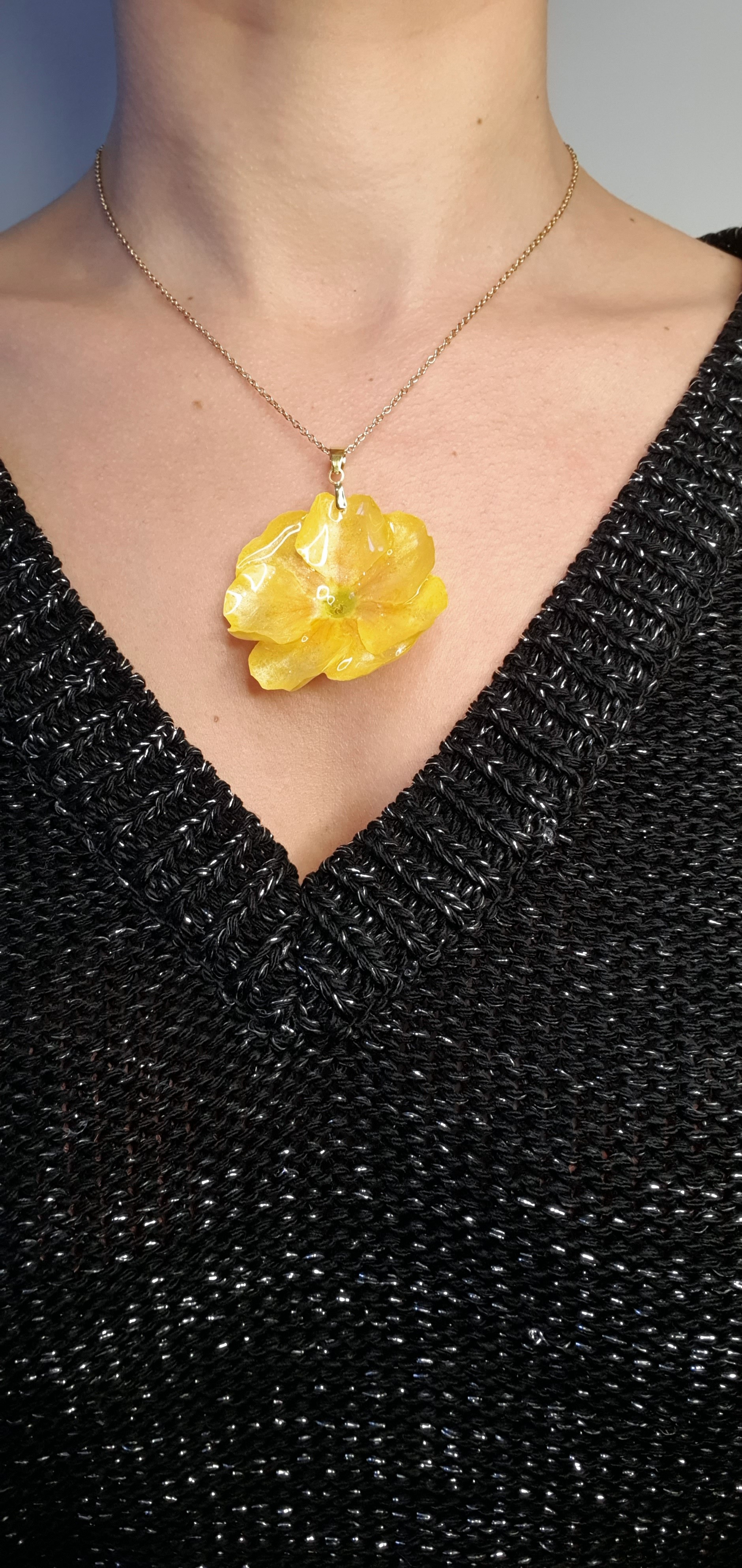 Cette parure met à l’honneur une véritable primevère jaune, récoltée à la main, séchée avec soin puis figée dans une résine jaune poudré, pour un contraste doux et lumineux.