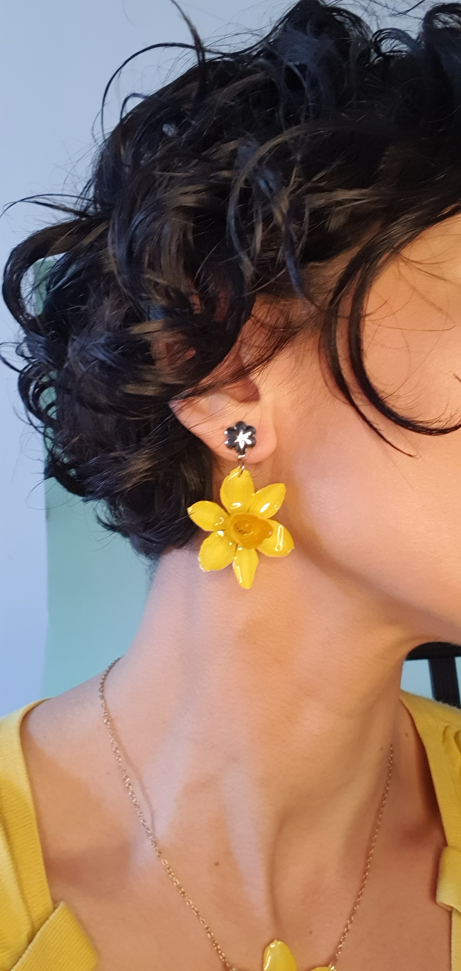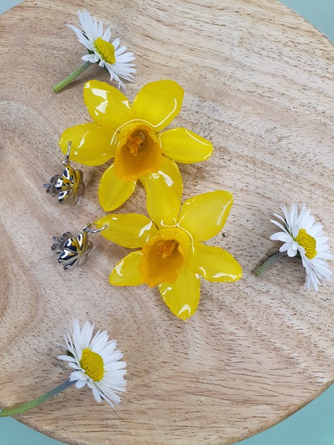 Ces boucles d’oreilles sont composées de véritables jonquilles, cueillies et séchées avec soin afin d’en préserver toute la beauté naturelle. Un bijou authentique, comme un fragment de nature suspendu.