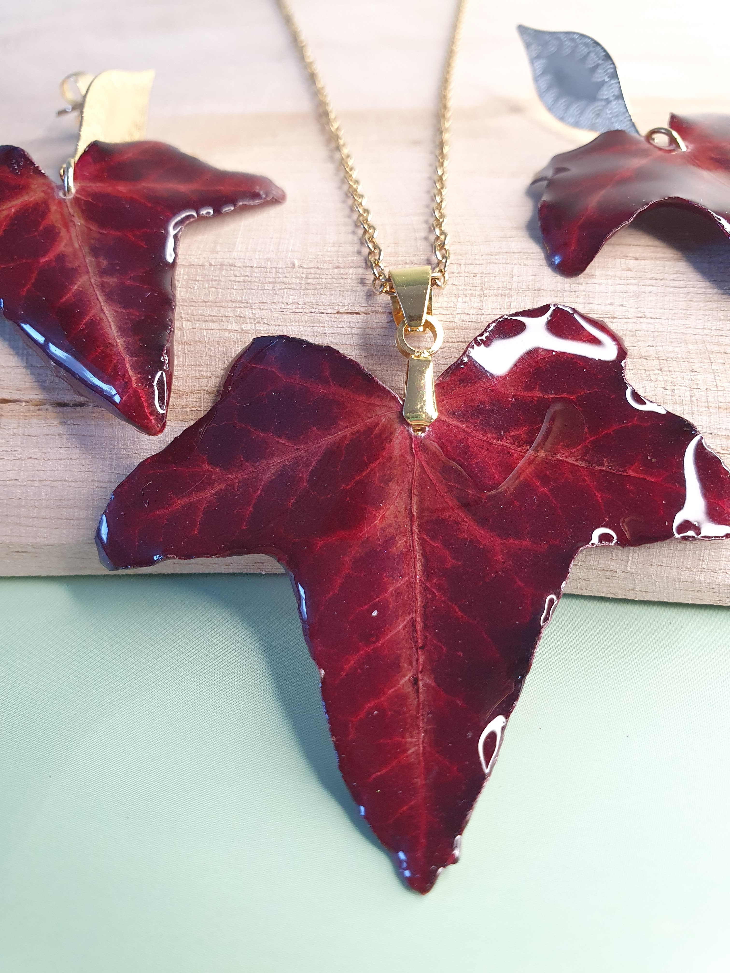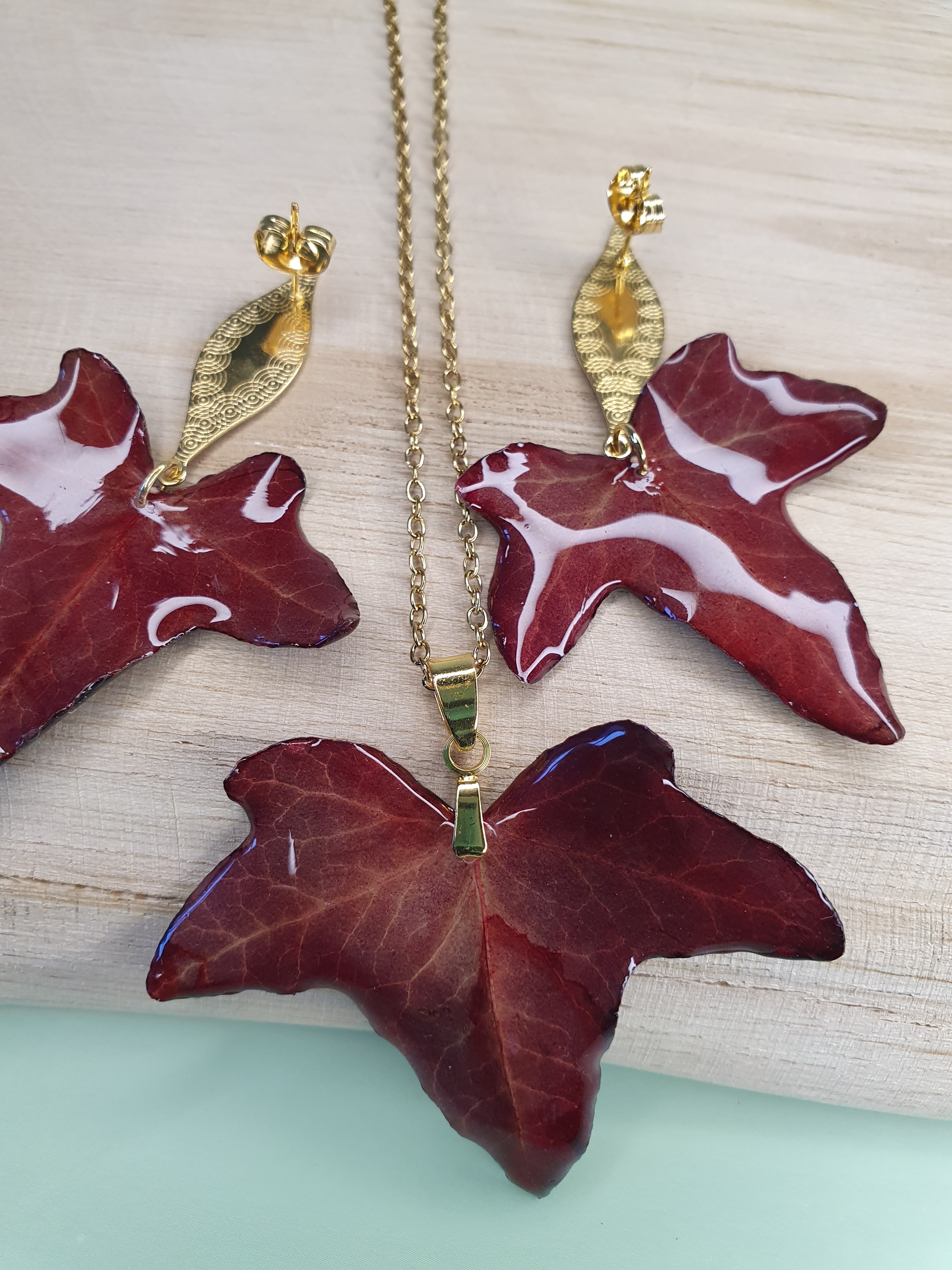 Cette parure met à l’honneur de véritables feuilles de lierre aux teintes rougeâtres d’automne, récoltées dans mon jardin puis préservées dans la résine.