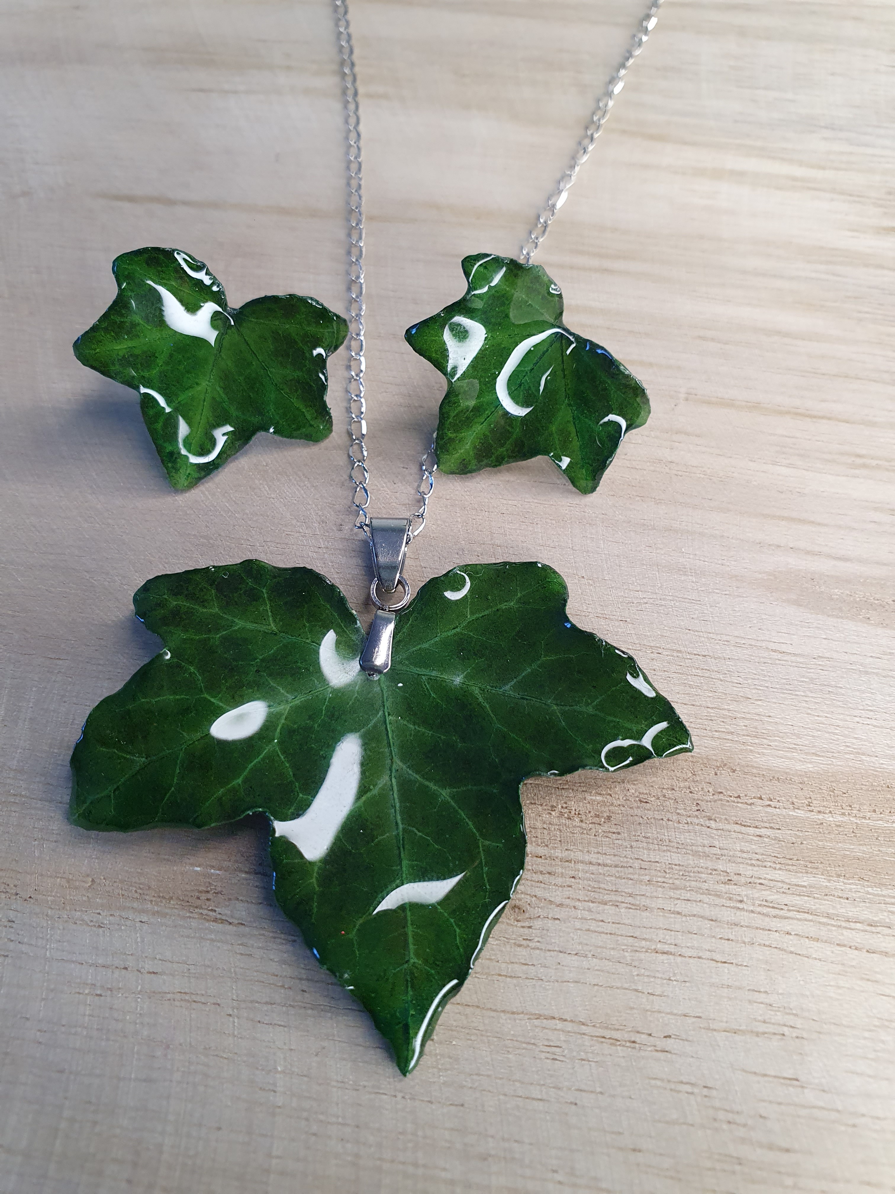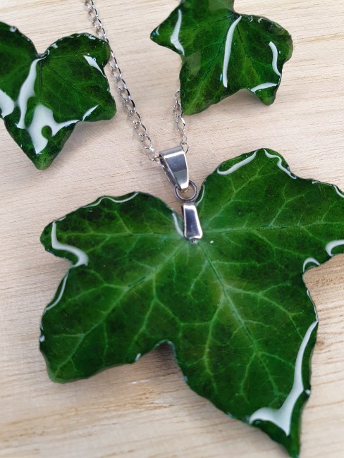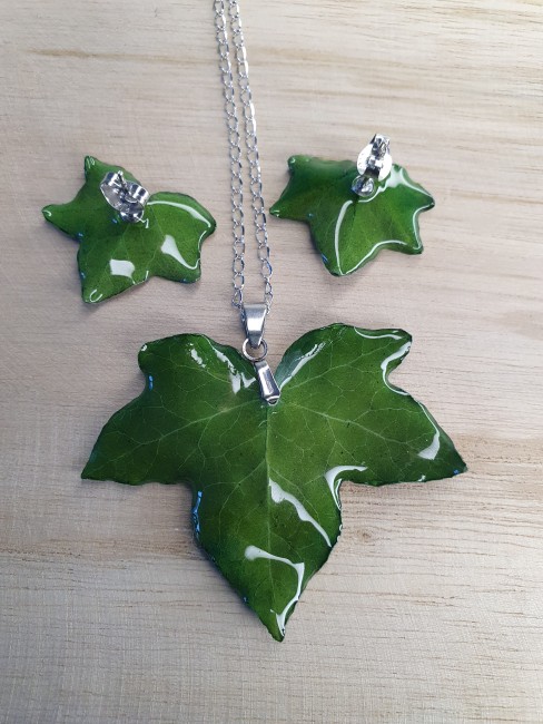 Cette parure associe un pendentif feuille verte et de petites feuilles montées façon puces d’oreilles, pour un rendu plus discret tout en gardant l’authenticité du végétal.