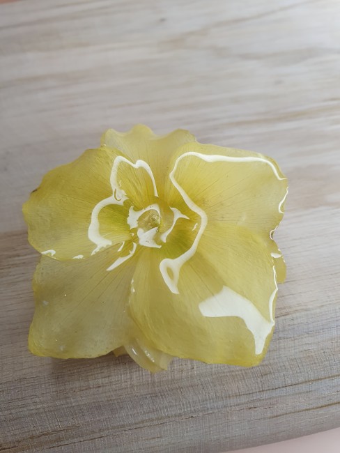 Une hellébore jaune pâle, tout en délicatesse et en relief, figée dans la résine.