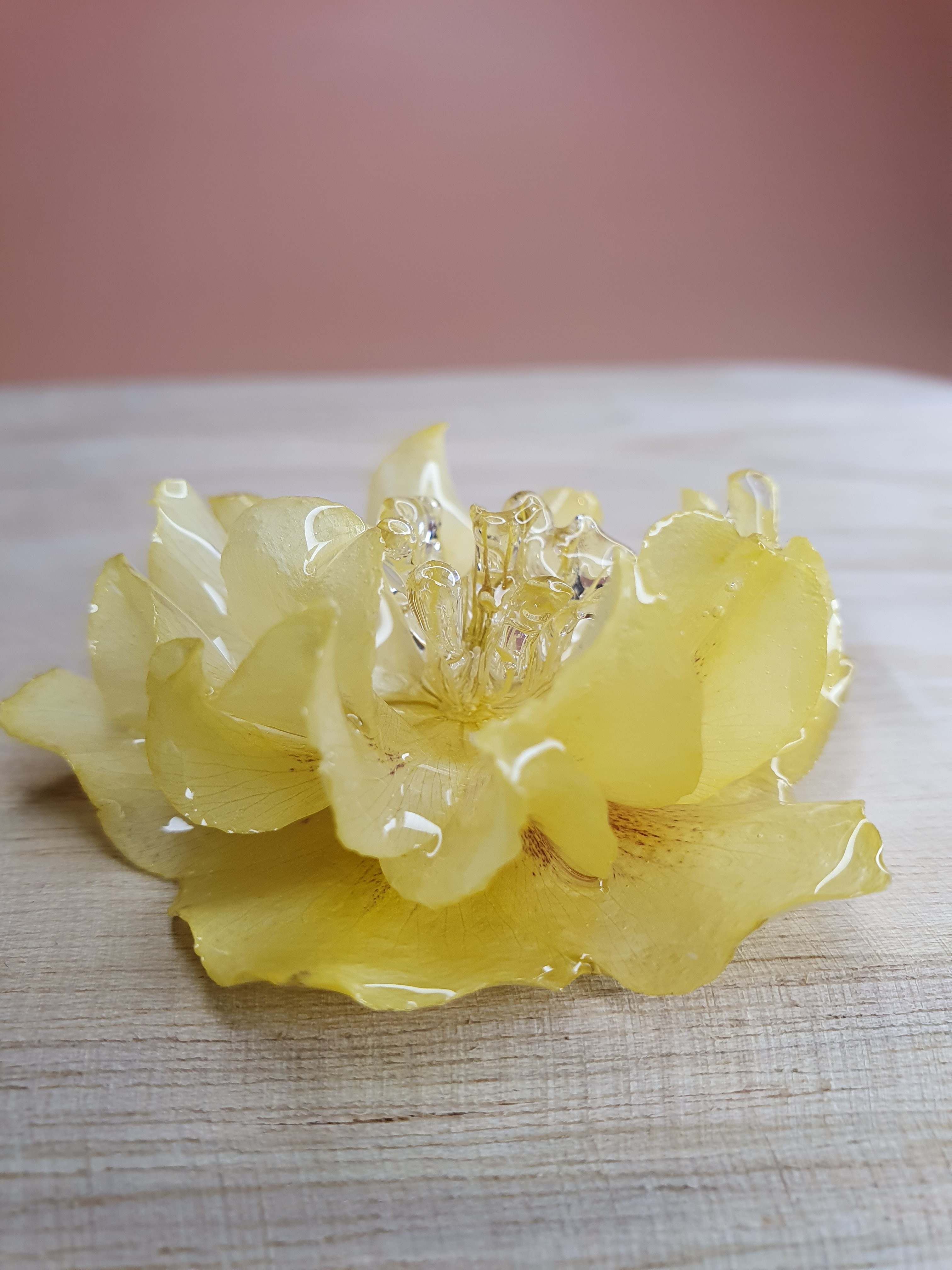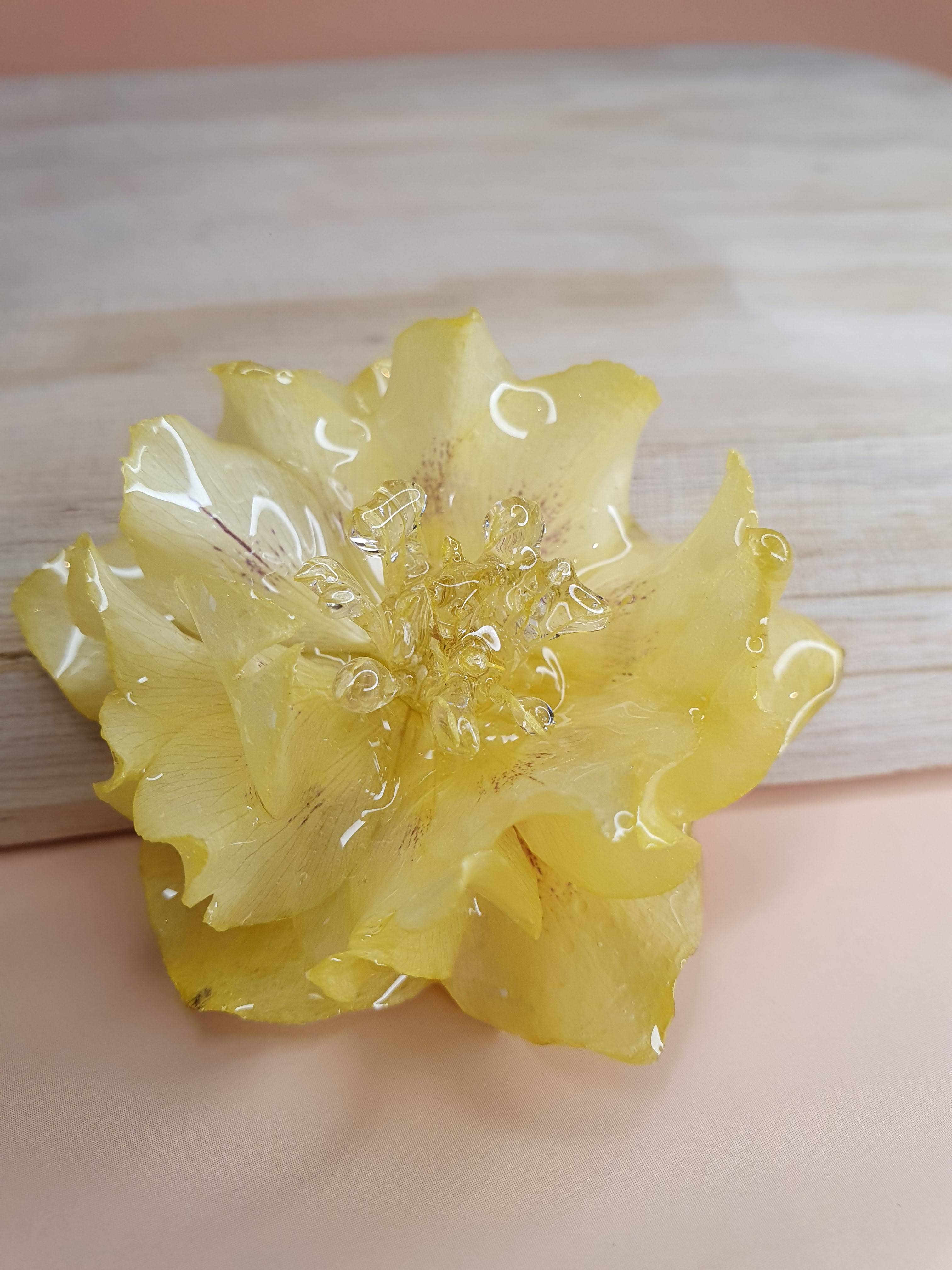 Chaque fleur est récoltée, séchée puis mise en résine par mes soins, afin de préserver son volume et son caractère unique.