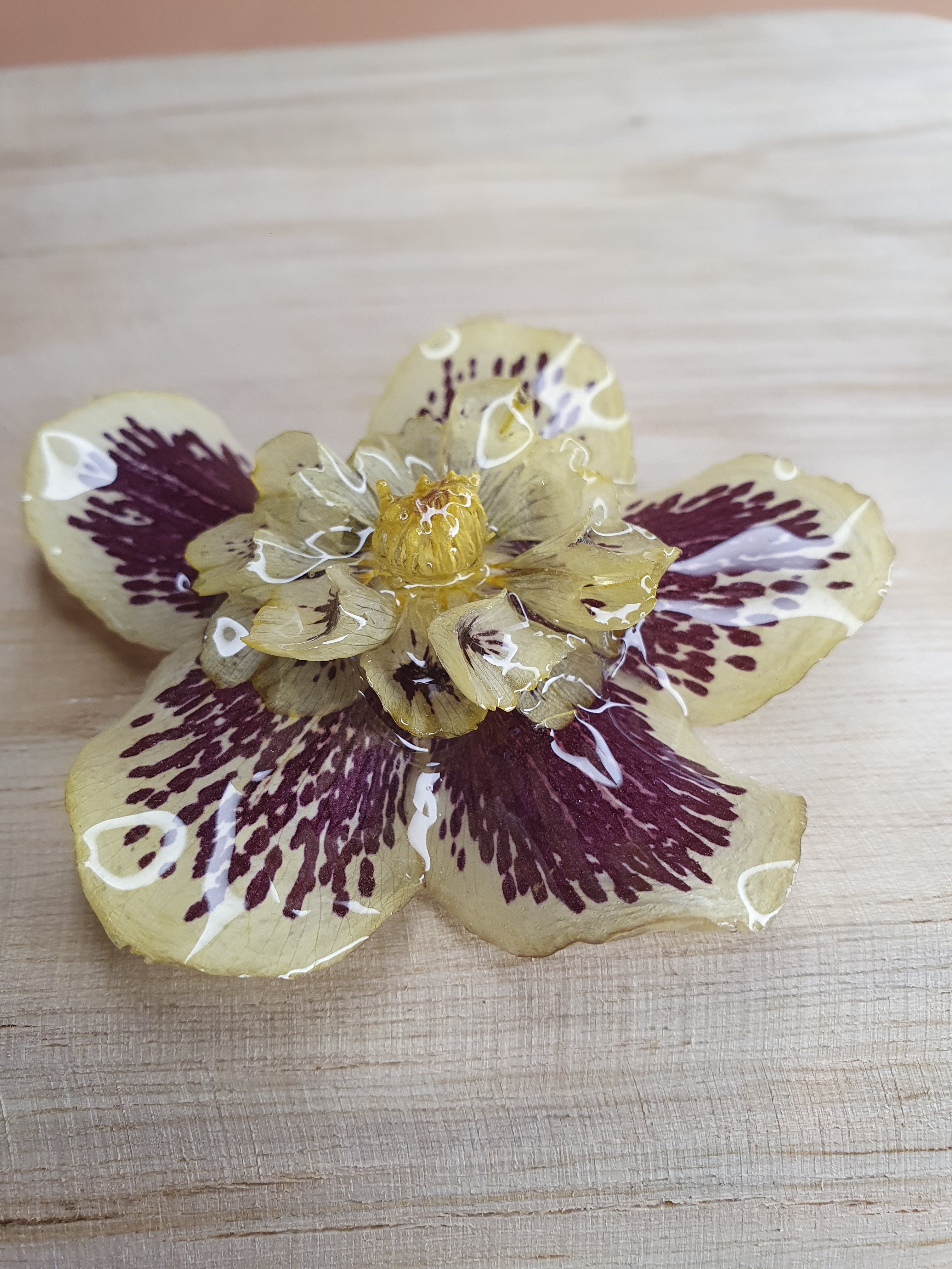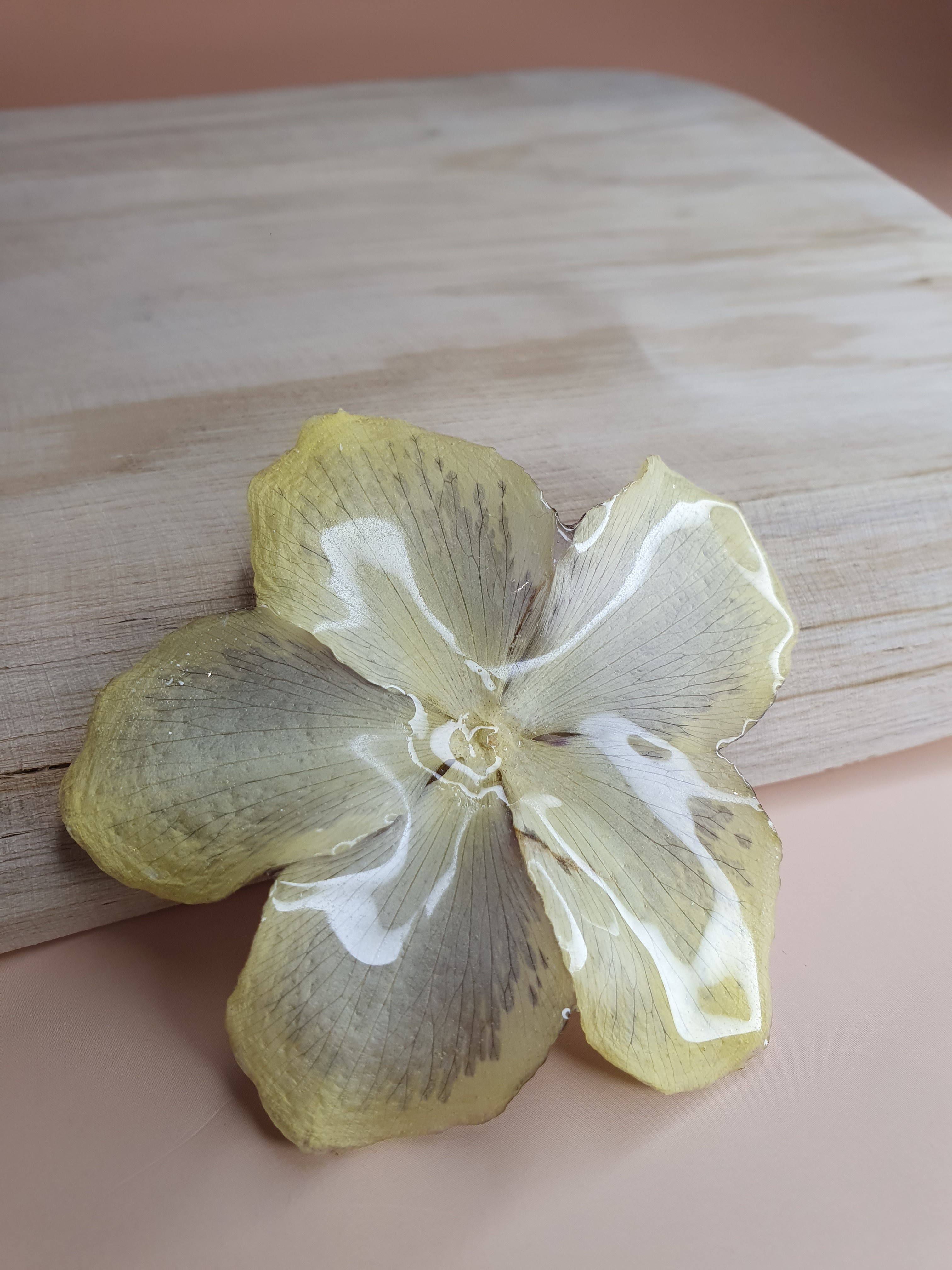 Chaque pièce est unique, la fleur ayant été séchée puis figée en résine par mes soins afin de préserver sa beauté naturelle.