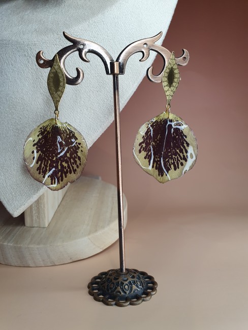 La fleur principale, d’un diamètre de 7 cm, dévoile de superbes nuances marron et crème, délicatement ponctuées de taches aux reflets bordeaux. Son cœur jaune généreux apporte lumière et relief à cette pièce unique.