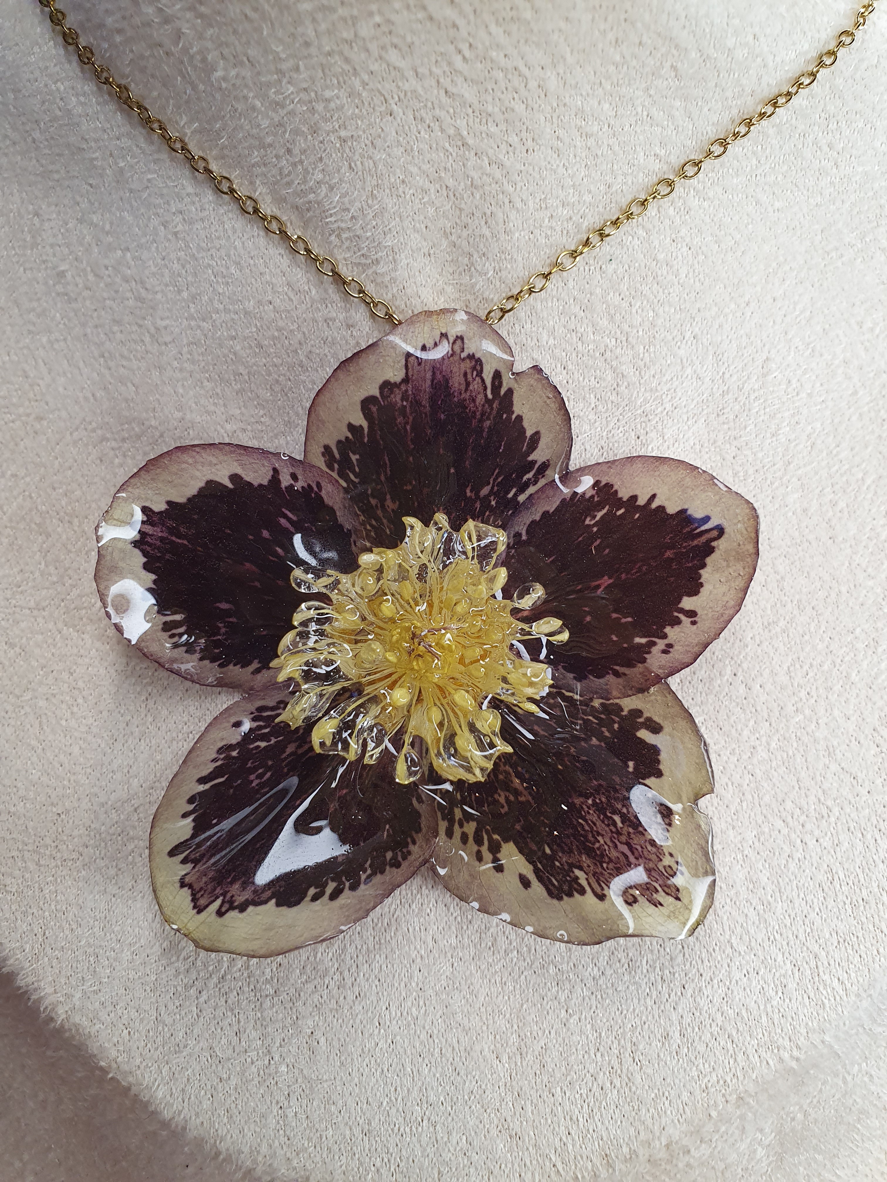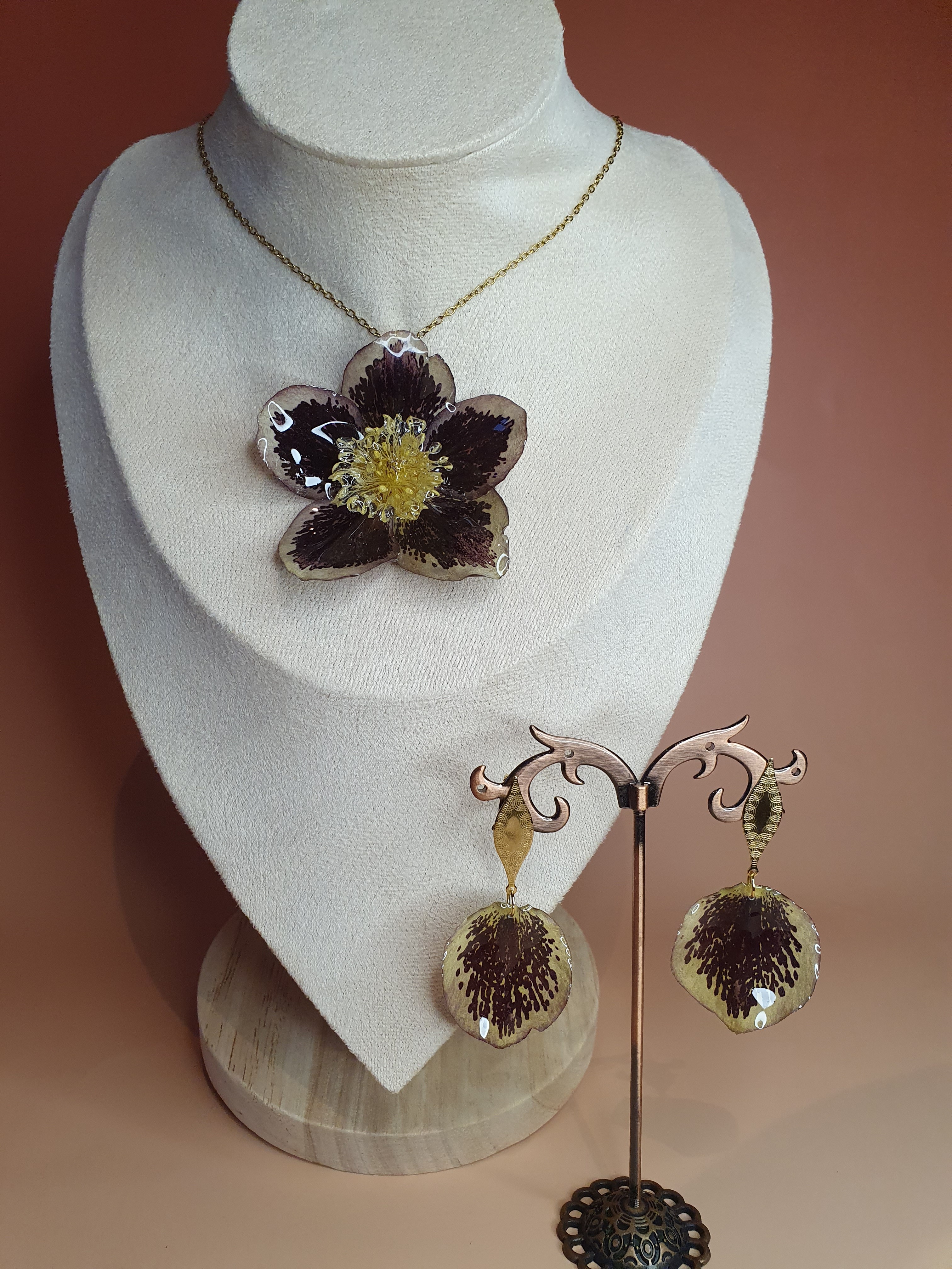 Une parure délicate composée d’un pendentif et de boucles d’oreilles assorties, réalisée à partir d’une véritable hellébore.